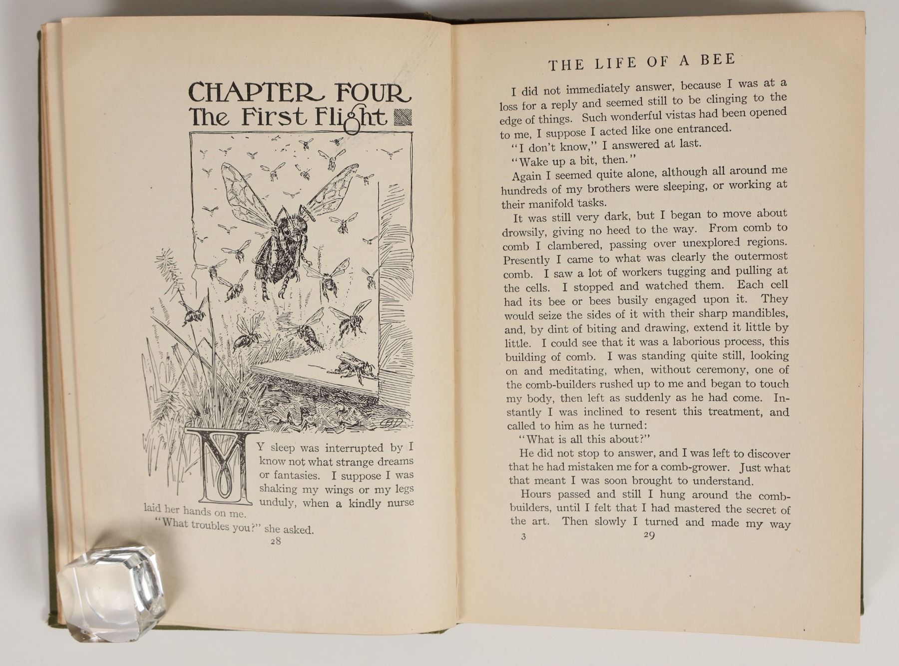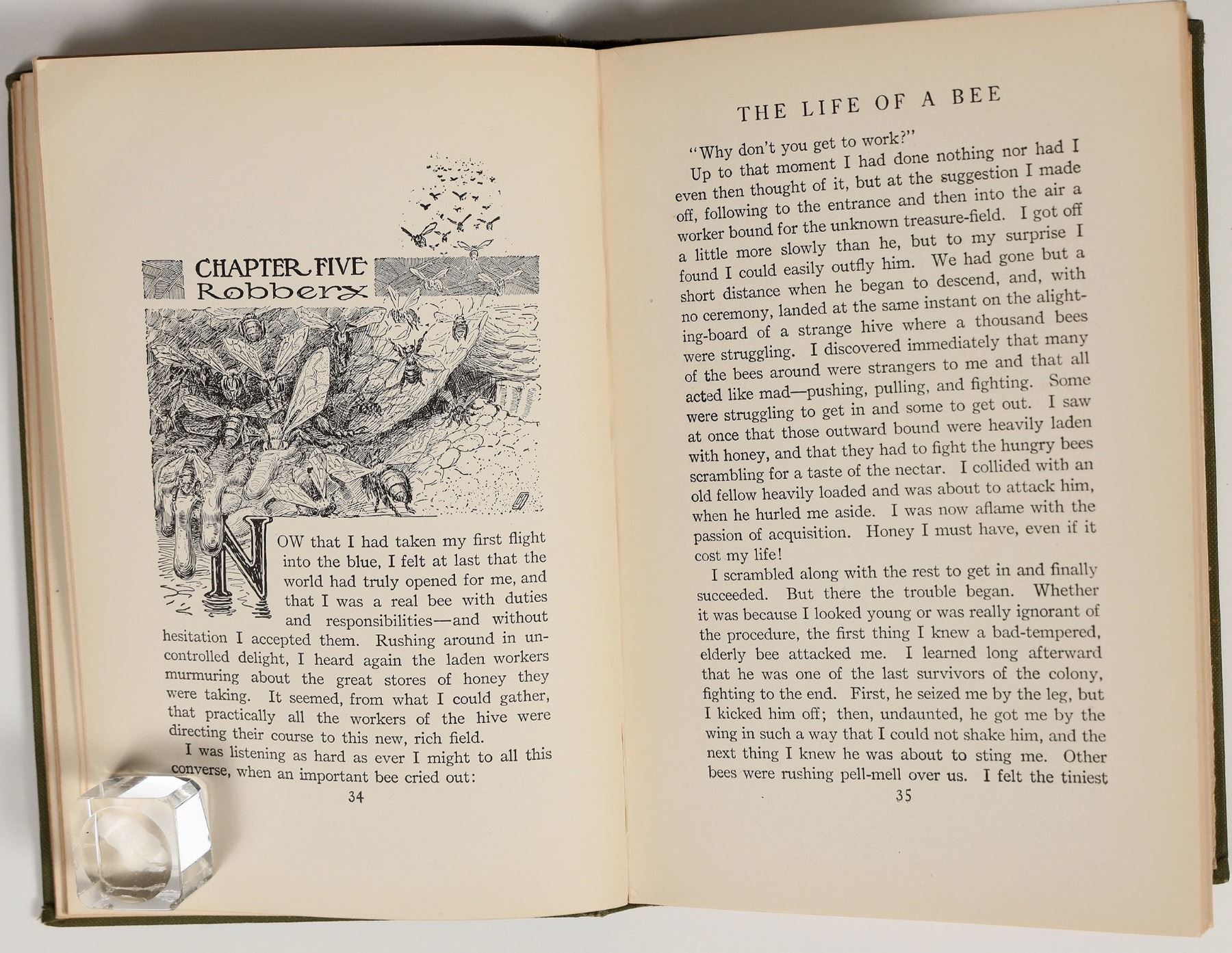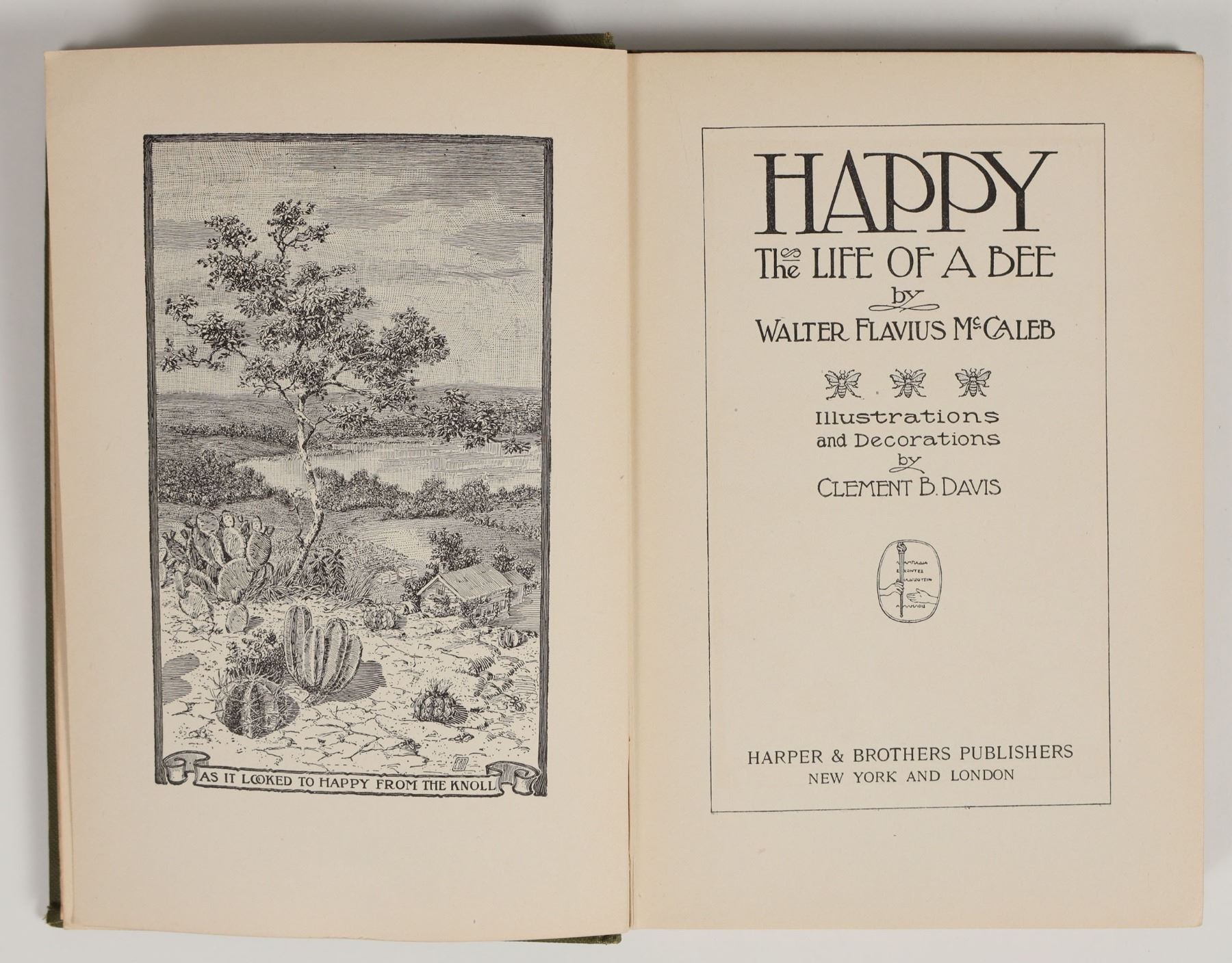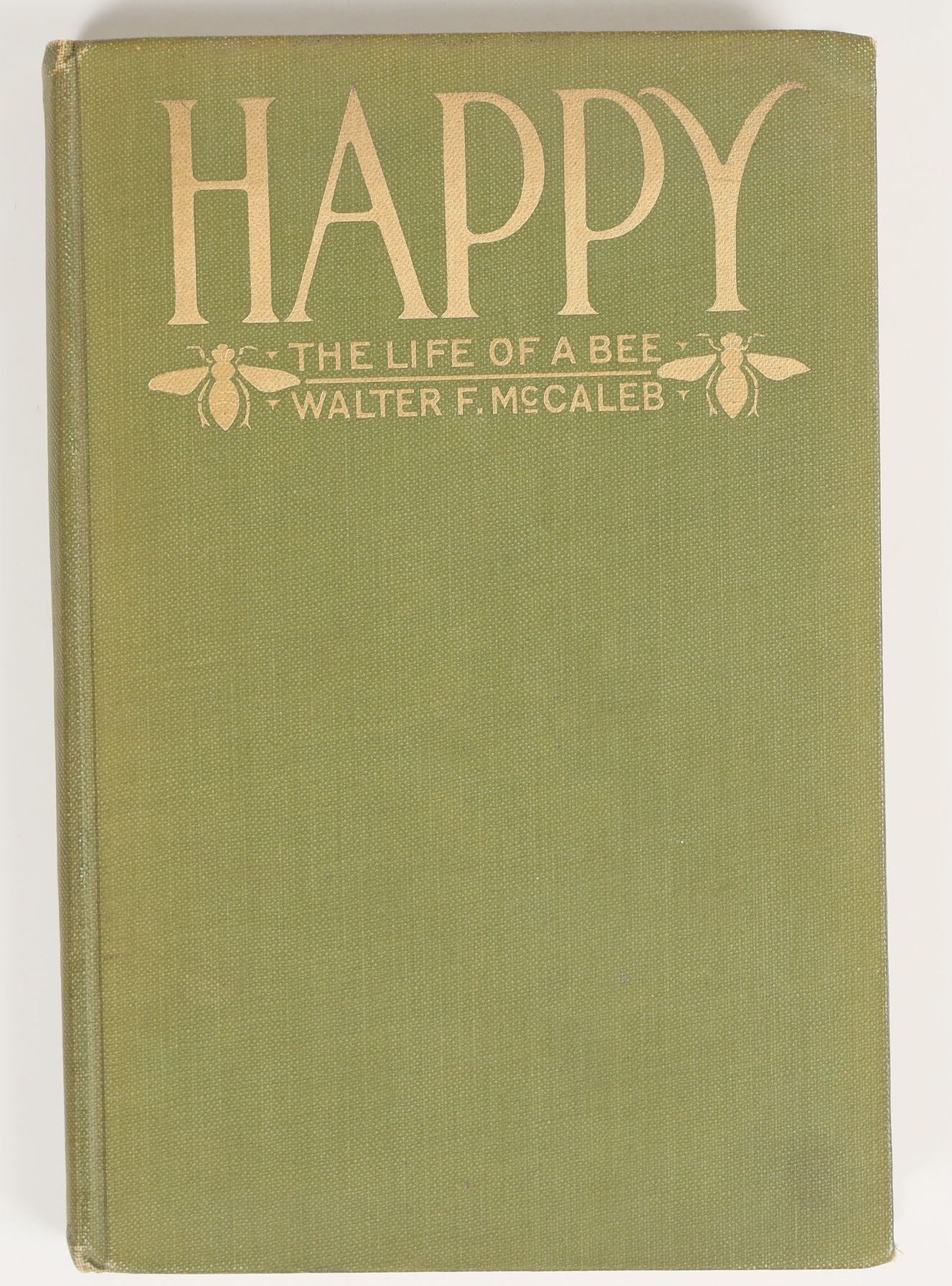 A first edition copy of "Happy: The Life of a Bee" by Walter F. McCaleb, a fantastical novel told from the point of view of a bee. Published 1917 by Harper & Brothers. Illustrated throughout with excellent line drawings, bound in green cloth w/ gilt lettering, no dust jacket. Good condition; some minor rubbing/rounding of corners on cover and tear on rear endpaper. Very stable binding. See photos. 5"x7.5"x0.5".