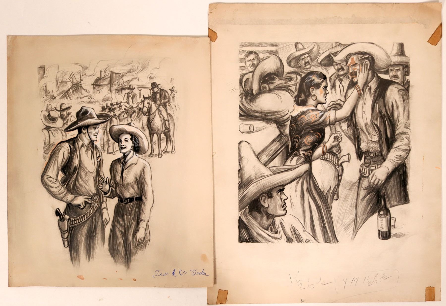 Two pencil illustrations. 1) happy couple on street of town, 11" x 7.5". Signed by Frank W. Coder. 2) Mexican woman trying to calm a cowboy down while other men look on. in a bar, 11" x 9.25".