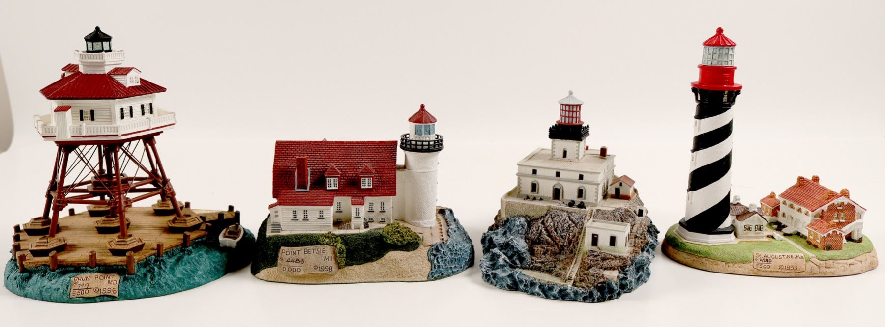 4 Harbour Lights miniature lighthouses. Point Betsie, MI 1998. Saint Augustine, FL 1993. Tillamook, OR 1998. Drum Point Point, MD 1997. All in original boxes. Approx 6-9" tall.