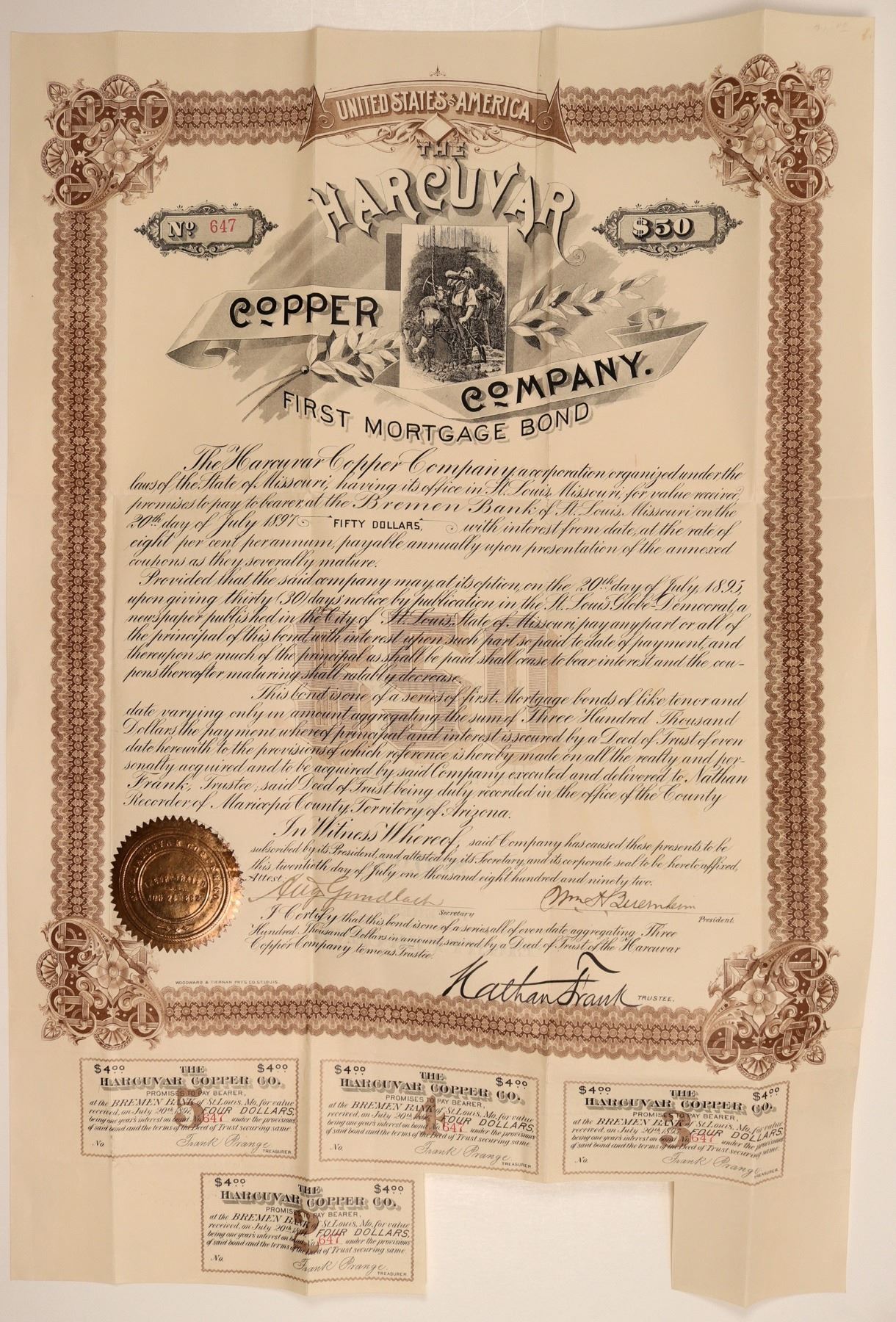 Rare. $50 bond no. 447, issued in 1892. Not cancelled. Signed by the president, secretary, and trustee. Brown border, black print, gold seal, and ornate title with mining scene incorporated into the center. Printed by Woodward & Tiernan, St. Louis. Four coupons still attached. Folds, overall very clean. 19.5 x 13" There appears to be a later (1907) incorporation of a company of the same name operating nine claims in the Harcuvar Mountains District of Yuma County._x000D_
