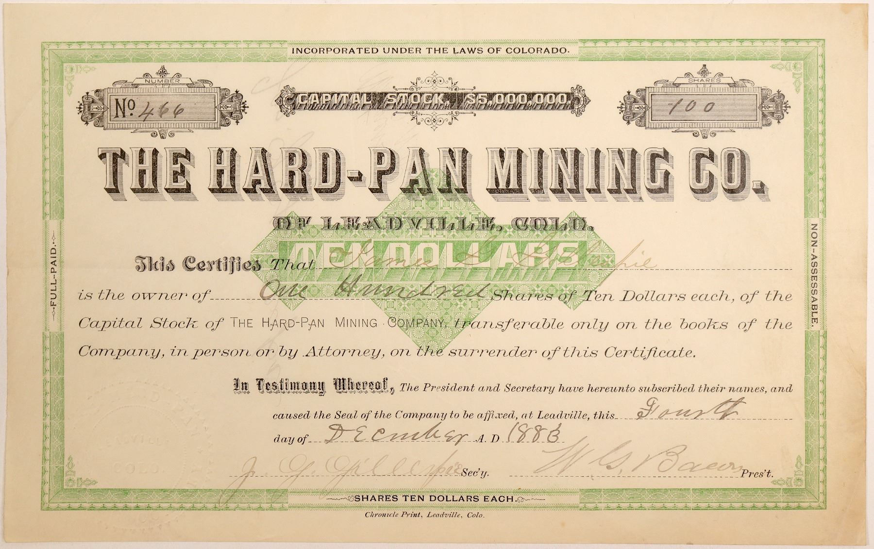 Inc. in Colorado. No. 466, issued for 100 shares to company secretary James G. Gillespie on Dec. 4th, 1883 in Leadville. Signed by Gillespie and president W. Bacon. Not cancelled. Green border and underprint, black print. No vignette. Printed by Chronicle Print, Leadville. Folds, creases to corners. 6.5 x 10" Not listed in C&L 1883 Colorado Mining Directory. Not in Filer or other Holabird indexes. No additional information located. Ken Prag Collection