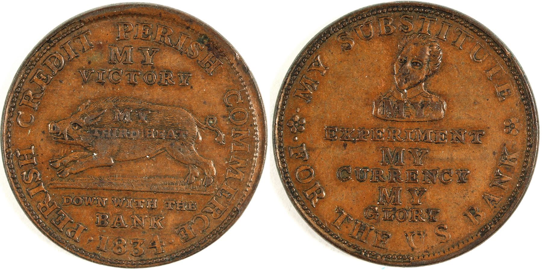 Obv.: My Substitute / For the U. S. Bank / My Experiment / My Currency / My Story; Rev.: Perish Credit / Perish Commerce / My Victory / My Third Heat / Down with the Bank / 1834. Br., rd., 29 mm. Choice condition.