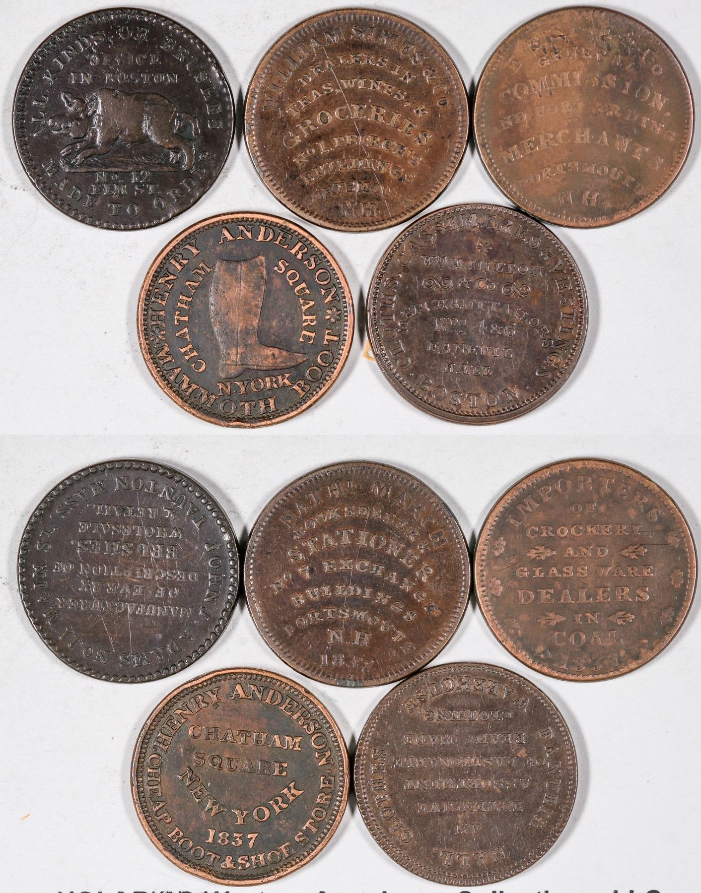 Lot of five: 1) HT-164a/L265A. Wm.H.Milton/Fanuell Hall. AU 50, R1. 2) HT-181/L300. Boar/John J.Adams.Glossy dark Choco/brn. VF 30, R1. 3) HT-195/L124. E.F.Sise Company/Portsmith, NH/Crocery and Glass ware. VF 20, R1. 4) HT-219/L?. Boot/Henry Anderson.Glossy chocolate brown surfaces. VF 30, R1. 5) HT-194/L124. Nath'l March/William Simes. EF 40, R1.