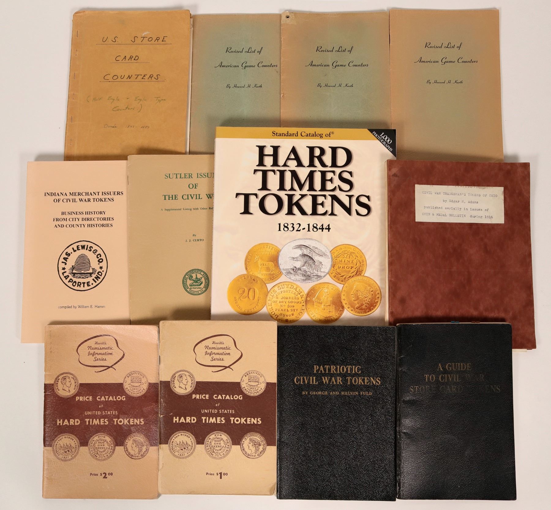 Lot of 12. 1) Revised List of American Game Counters- Howard H. Kurth (3). 4) U.S. Store Card Counters. 5) Patriotic Civil War Tokens By George and Melvin Fuld. 6) Indiana Merchant Issuers of Civil War Tokens- William E. Hamm. 7) Civil War Tokens of Ohio- Edgar H. Adams. 8) Sutler Issues of The Civil War- J. J. Curto. 9) A Guide to Store Card Tokens- unknown. 10) Price Catalog of United States Hard Times Tokens (2). 12) Hard Times Tokens 1832-1844 by Russell Rulau.