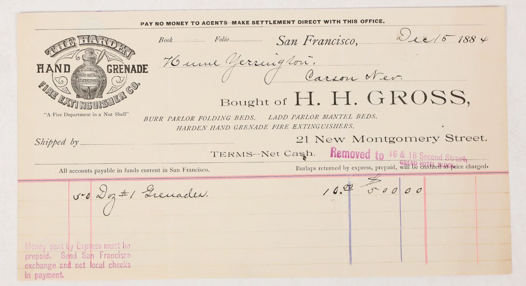 Fantastic!! From the Fred Holabird Collection. Pictorial 1884 billhead for HH Gross with vignette in upper left of the Harden hand grenade fire extinguisher! Billed to Hume Yerington in Carson City (who worked for his father at the Virginia & Truckee Railroad) for 50 dozen grenades.