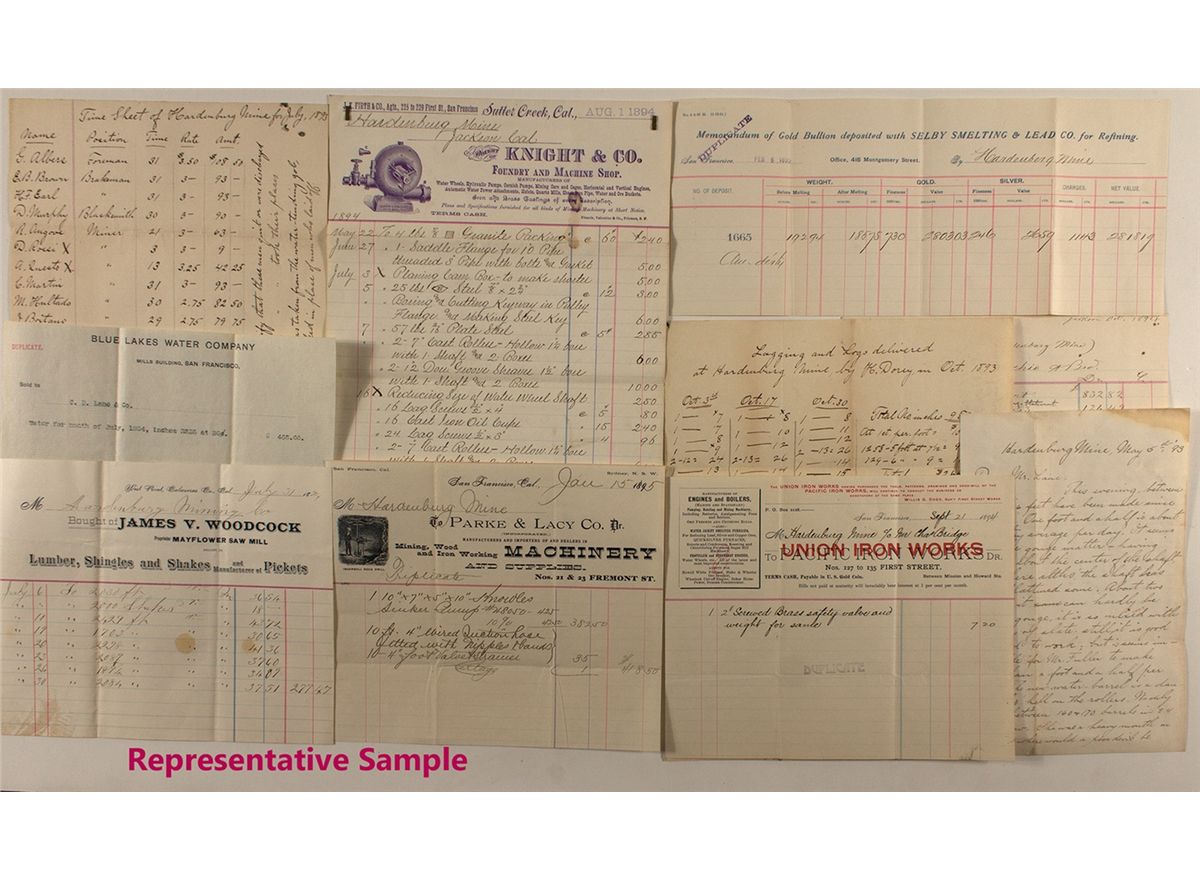 54 pieces from expense accounts to Selby gold bullion deposits; from time sheets to logs and logging reports. Also a series of items purchased on billheads from Blue Lakes Water Company, Knight & Company of Sutter Creek, James Woodcock lumber, Pacific Iron Works, Parke & Lacy mining machinery. 1893 mining letter to Thomas Lane about digging progress and cost of rollers made locally and in San Francisco.City: JacksonCounty: AmadorState: CADate: