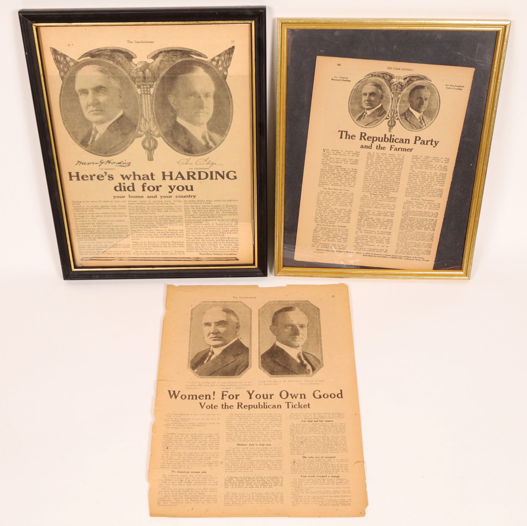 Lot of 3. Two framed and one not newspaper ads for Harding/Coolidge Presidential ticket. One article is from The Farm Journal (framed) and One from the Gentlewoman (framed, broken glass) and one from The Gentlewoman not framed. Good condition, shows age.