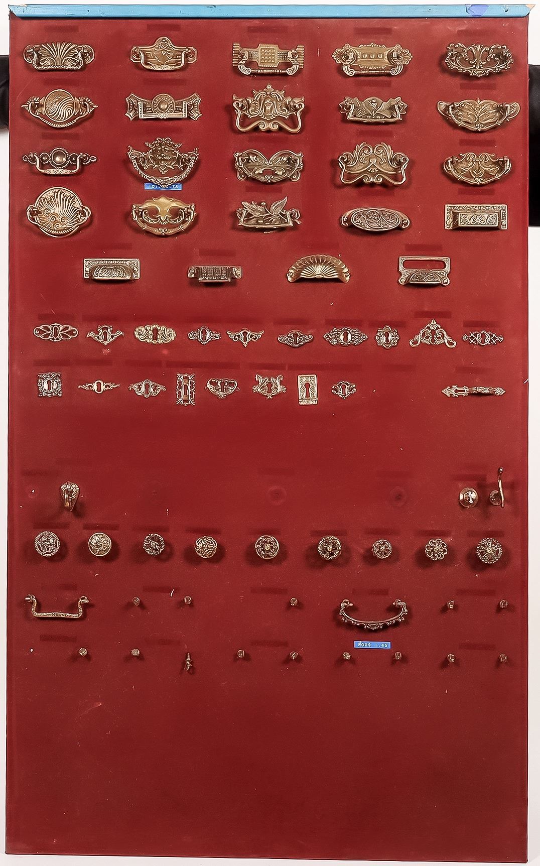 This display of hardware is for drawer pulls and lock surrounds with over 60 set available. All brass casts. Please see photo for details. 30 in. X 48.5 in. display._x000D_