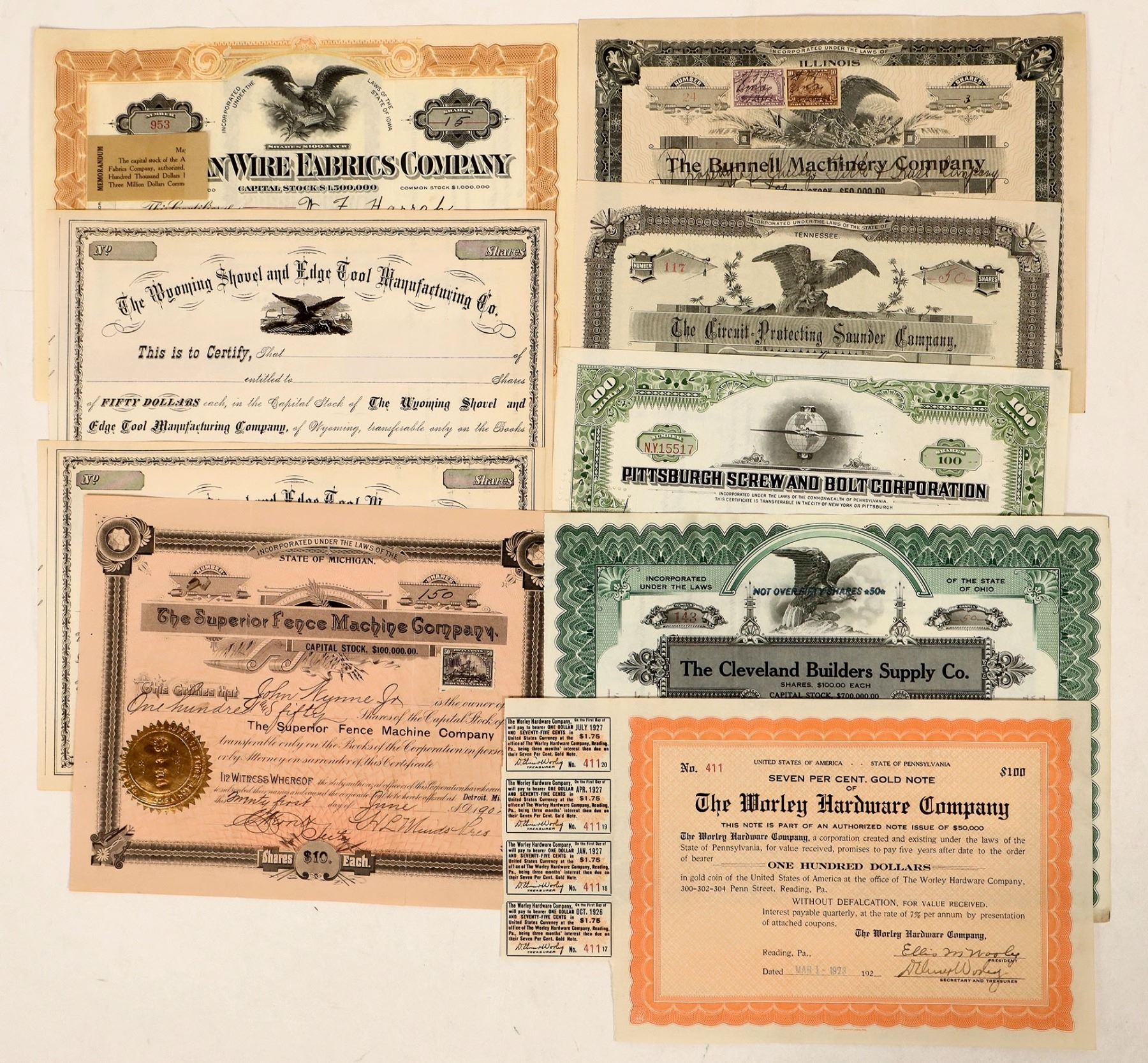 1921 American Wire Fabrics, 1917 Cleveland Builders Supply, 1902 Superior Fence Machine, 1940 Pittsburgh Screw and Bolt, 1923 Morley Hardware bond, 1901 Bunnell Machinery, 1896 Circuit Protecting Sounder, 2x unissued Wyoming Shovel and Edge Tool Manufacturing.