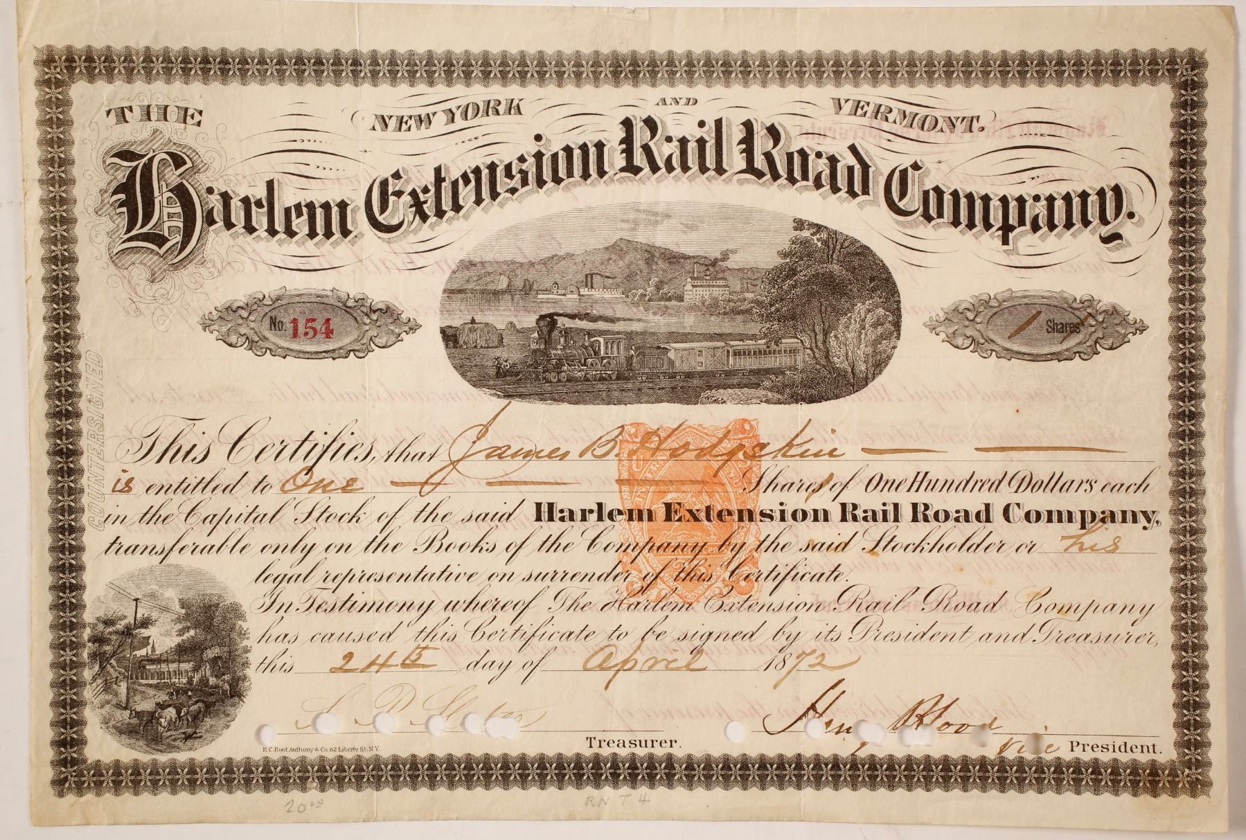 Cancelled one share of Harlem Extension Rail Road Company, number 154, signed April 24, 1872 by Henry Blood, vice president and S.P. Slater, treasurer. Two train vignettes. Brown border, black ink. Imprinted Revenue paper TNT4. The Harlem Extension Railroad started operations in 1870 and stopped service in 1873. Harlem Extension Railroad operated routes in New York and Vermont. Printed: R.C. Root Anthony & Co, 62 Liberty Street, N.Y. State: City: Date: HWAC# 83705