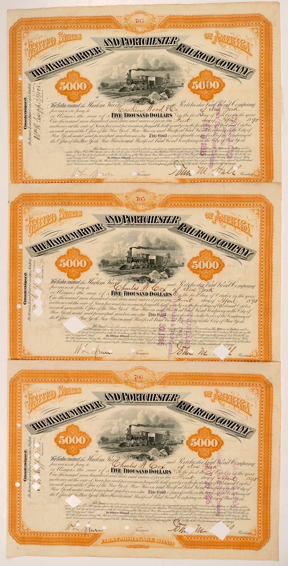 3 cancelled certificates for $5,000 1st Mortgage bonds for Harlem River and Portchester Railroad Co. bond. Raised company seal, orange border. Vignette of moving train top center of certificate. Signed by treasurer and president, countersigned and assigned. Printed: Continental Bank Note Co. N.Y. Harlem River and Port Chester Railroad chartered in 1866 as a branch line railroad between New York City and Port Chester, NY. Line opened in 1873 as part of the New York, New Haven and Hartford commuter railroad and ran until 1971. Now part of Amtrak's high-speed Northeast Corridor.