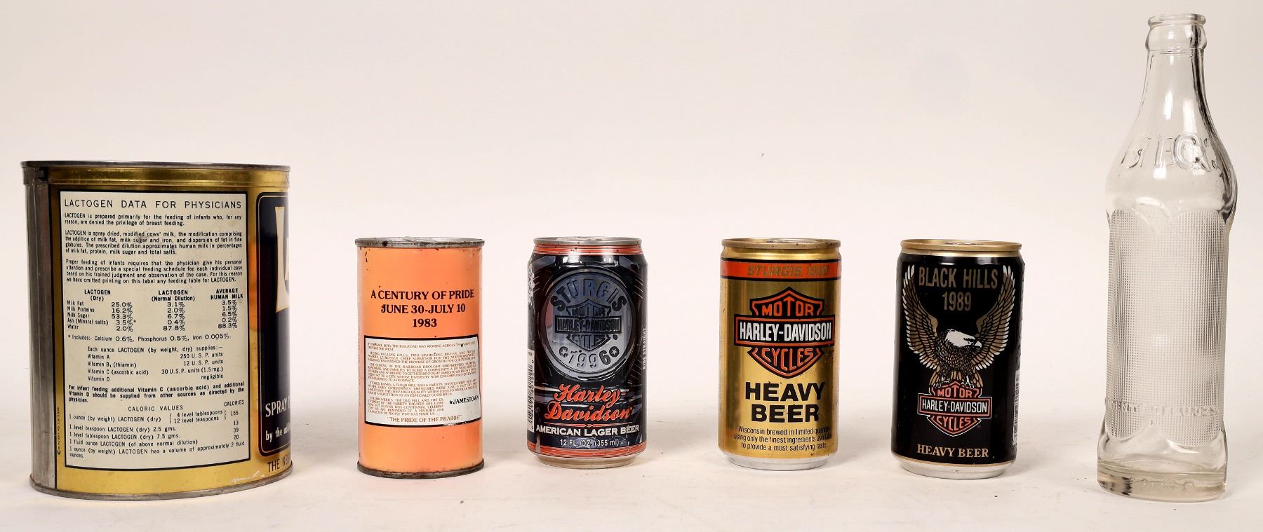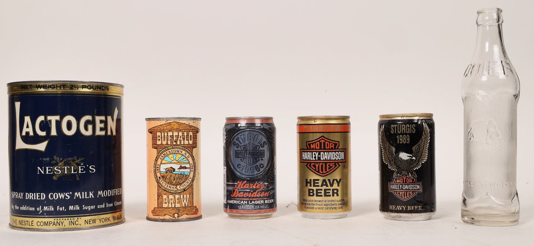 Harley Davidson beer cans in unopened condition-Sturgis 1996, 1988, 1989. Buffalo Brew 1983. Unopened Lactogen can with key. Clear Big Chief soda bottle.
