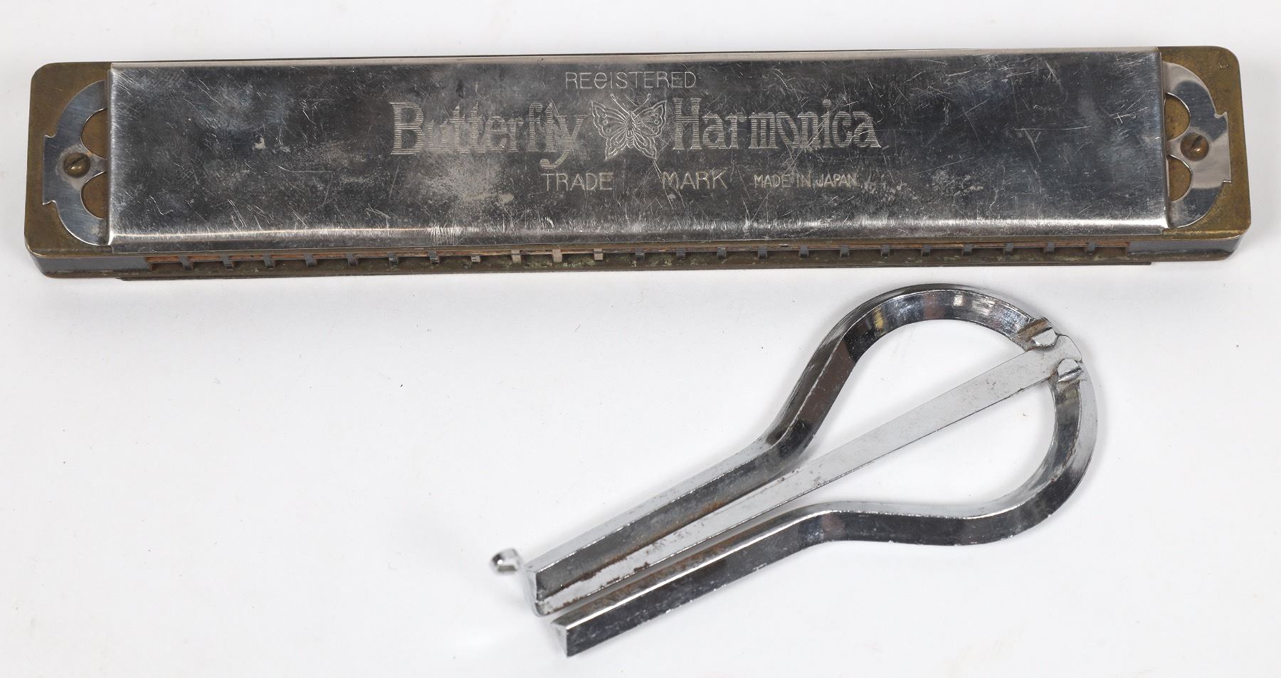 A) Butterfly Harmonica made in Japan. 24 holes. Engraved on both sides. 7.25 inches long. _x000D_