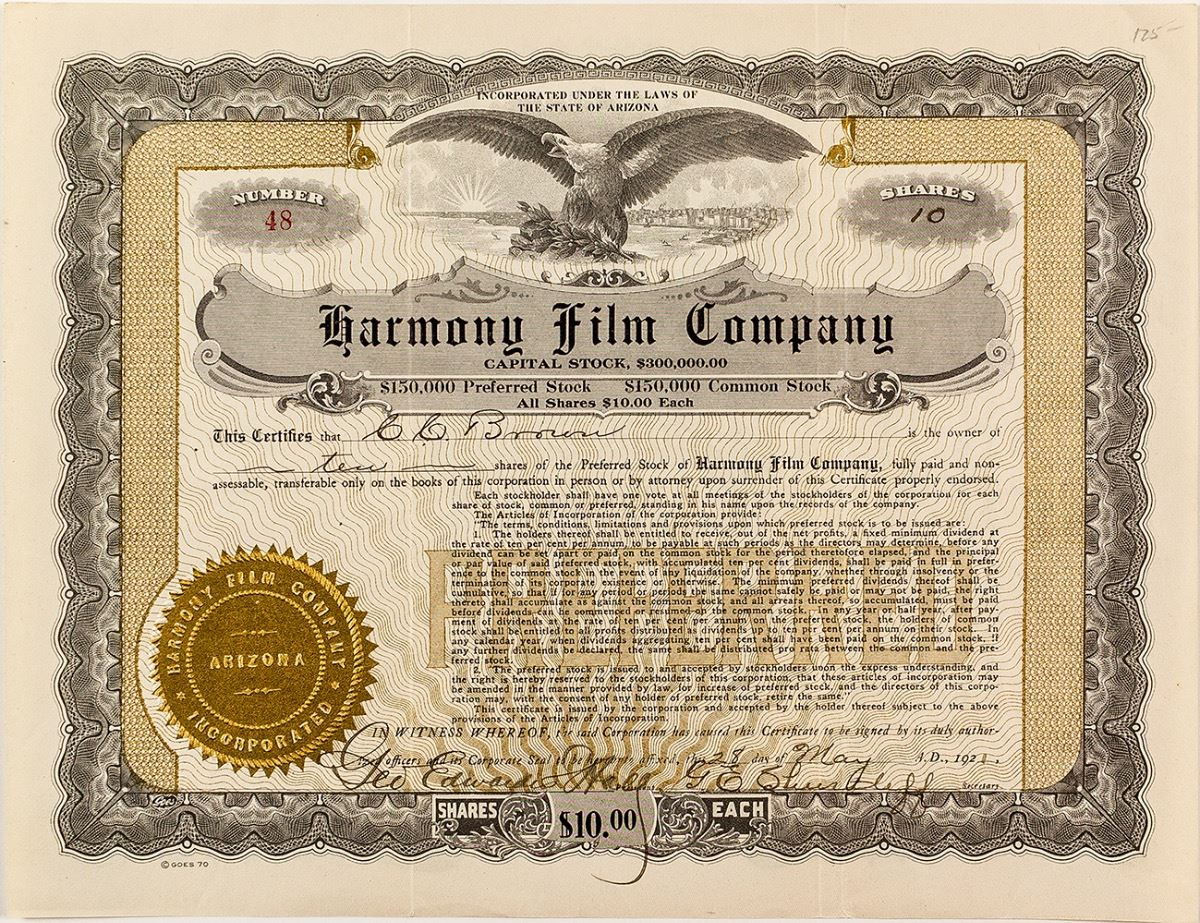 Inc. in Arizona. No. 48, not cancelled. Issued for 10 shares to C.C. Brown on May 28, 1921.Signed by Geo. Edward Hall as president and the secretary. Gold seal, black border, and eagle vignette. Folds. (Prag Collection) City: State: Date: 1921 ID# 31353