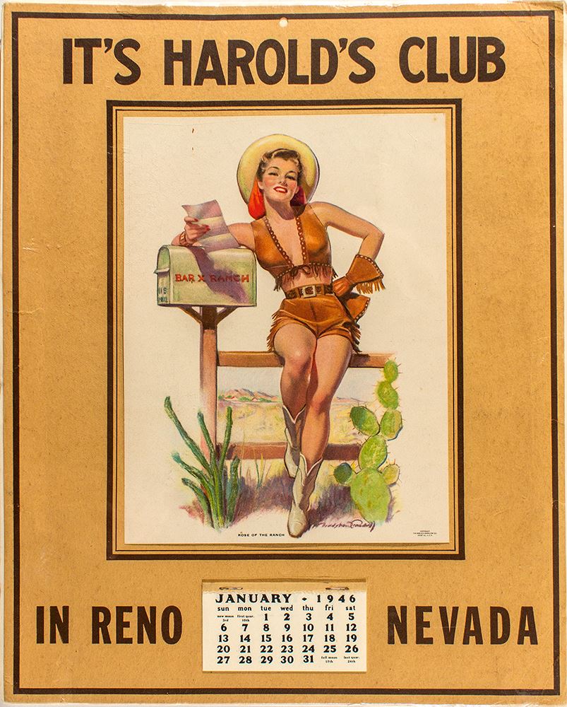 15" x 12" calendar with 9" x 7" print showing scantily dressed cowgirl sitting on a fence next to a Bar X Ranch mailbox. Titled, "Rose of the Ranch." Copyright The Gerlach-Barklow Co. in Joliet, Ill. Text at top and bottom of calendar: "IT'S HAROLD'S CLUB/ IN RENO NEVADA." Calendar pad (2" x 3.5") attached bottom center. A few creases, otherwise very nice.