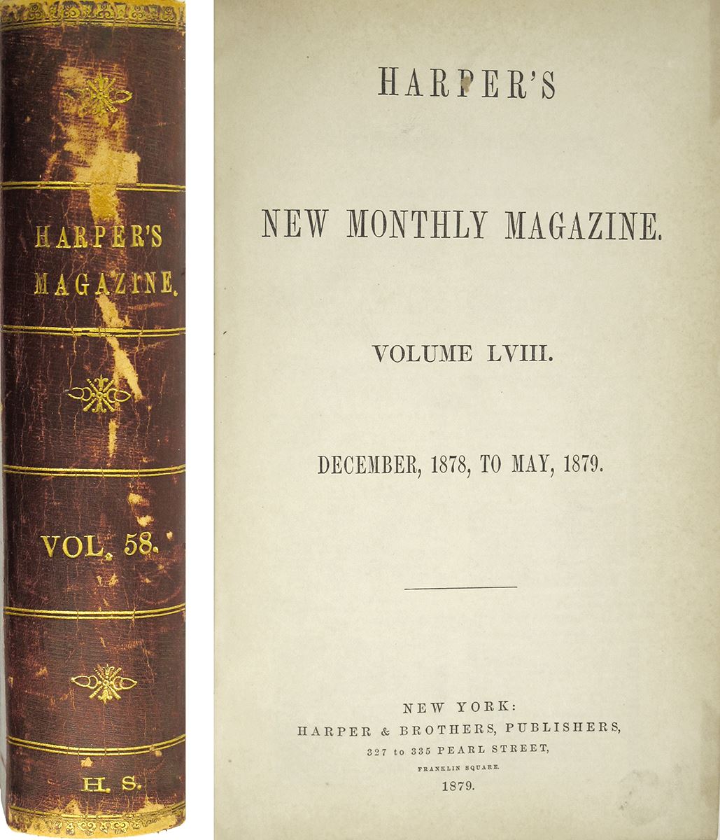 Harper’s New Monthly Magazine. Volume LVIII. December, 1878 to May, 1879. New York: Harper & Brothers , Publishers, 327 to 335 Pearl Street, Franklin Square, 1879. 952 pages, no index and drawings in articles. Collection of monthly publications from Dec. 1878 to May 1879. Hardcover, leatherette spine. Corners of cover are worn slightly and gilt inscription on spine is faded. No dust jacket. Measures 9 ¾’’x 6 ¾’’. It contains a comprehensive article published in December 1878 on Silver; the various forms of silver ore and the different methods of refining. It is illustrated with 11 fine drawings showing among other things timbering, mine cross-sections, pumping, drilling, a furnace, and wet and dry process mills.
