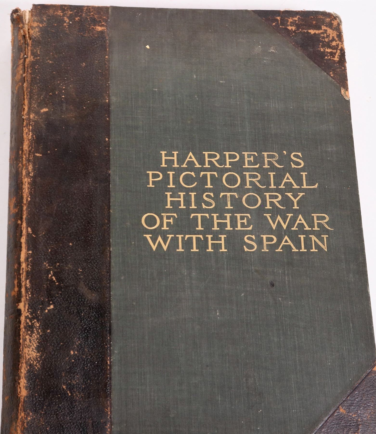Large coffee table book published by Harpers, regarding the Spanish-American War. The book is full of black & white block ink prints as well as color prints of the conflict that took place in Cuba and the Philippines. The cover is worn, but not awful. Great historical record. 1899