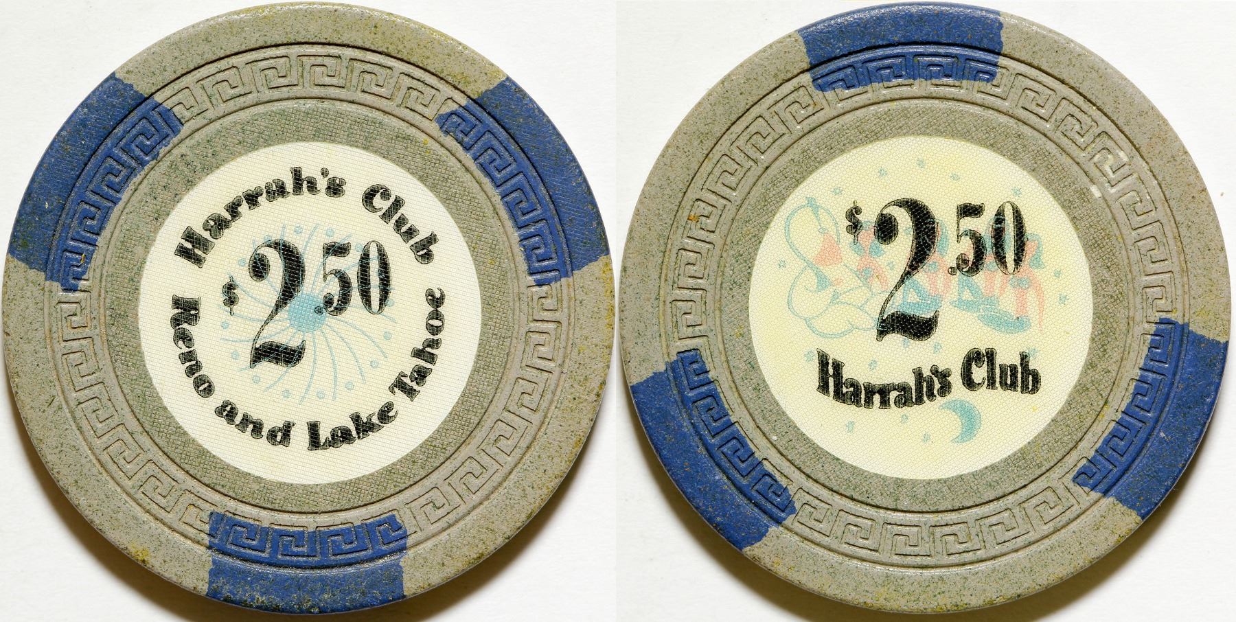 Rare blue and grey $2.50 early chip from Harrah's Club of Reno and Lake Tahoe. Salvatore Falcone Collection.
