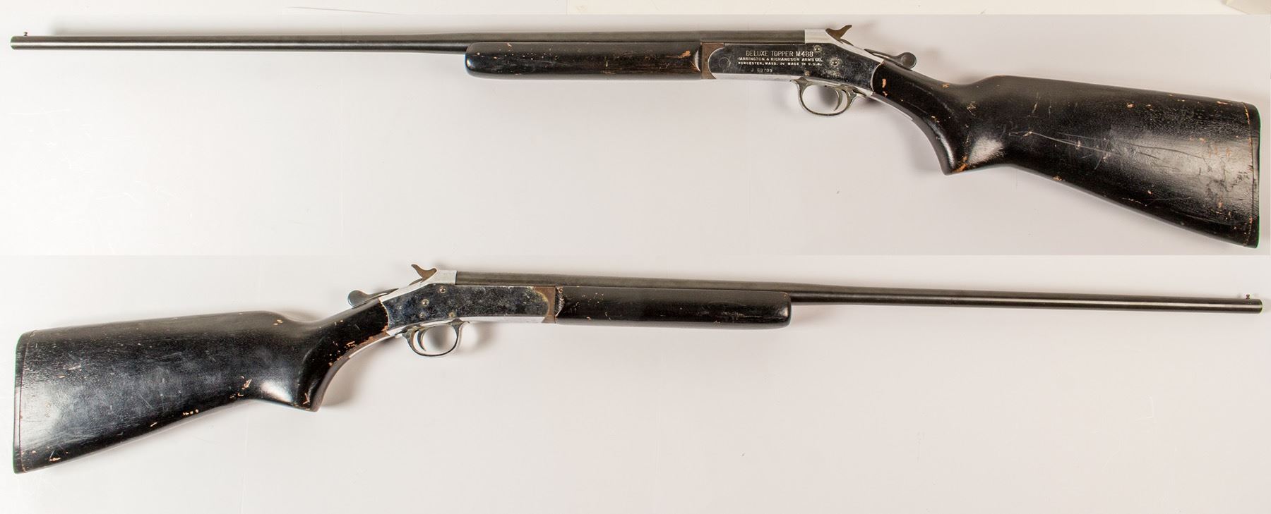 This H & R deluxe topper .410 shotgun has a 28 in. tapered choked barrel. It is a .410 break-action barrel shotgun. The receiver is nickel plated, blued barrel and barrel release with case hardened rebounding hammer. The bluing and nickel are in excellent shape. It has a rear sight groove and muzzle bead front sight. This has a semi-deluxe pistol grip and widened fore grip with factory painted black furniture. Excellent H & R logo'ed hard rubber butt-plate. It also has an ambidextrous barrel release for left handed and right handed shooters. A well balanced professional long range single shot .410 shotgun. S/N J697xx