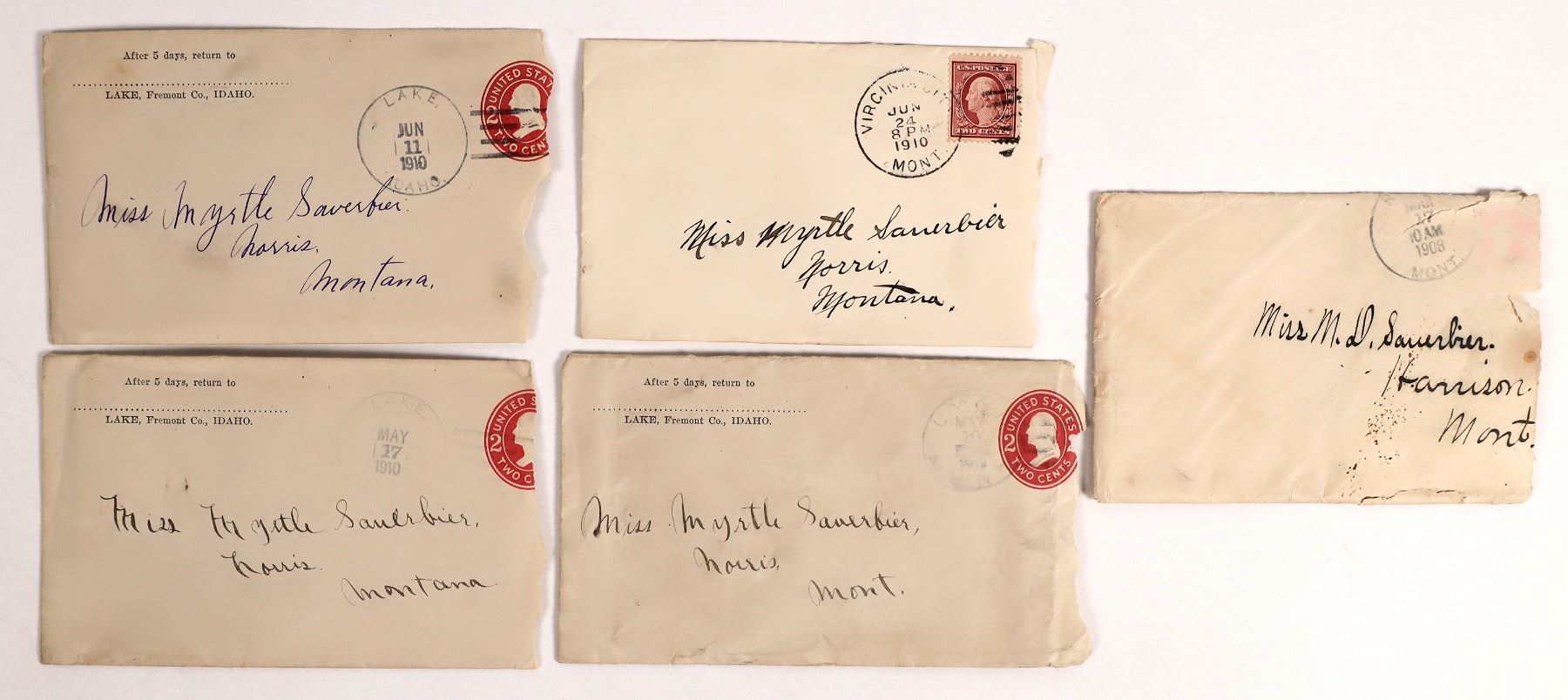 5 covers to Harris, MT c. 1908-10. 4 embossed, 1 red 2c adhesive stamp. Montana Harris