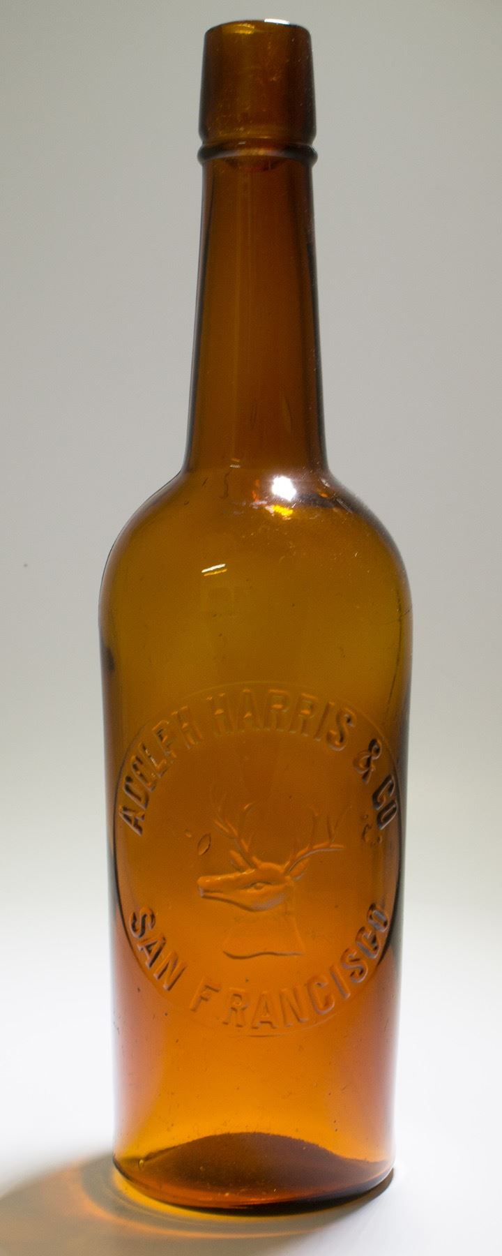 Harris Deer Head Medium Amber, Adolph Harris & Co., San Francisco. Pictorial Whiskey. Approx 12 x 3.25 inches. No apparent cracks or chips. State: City: HWAC#: 48371 Date: