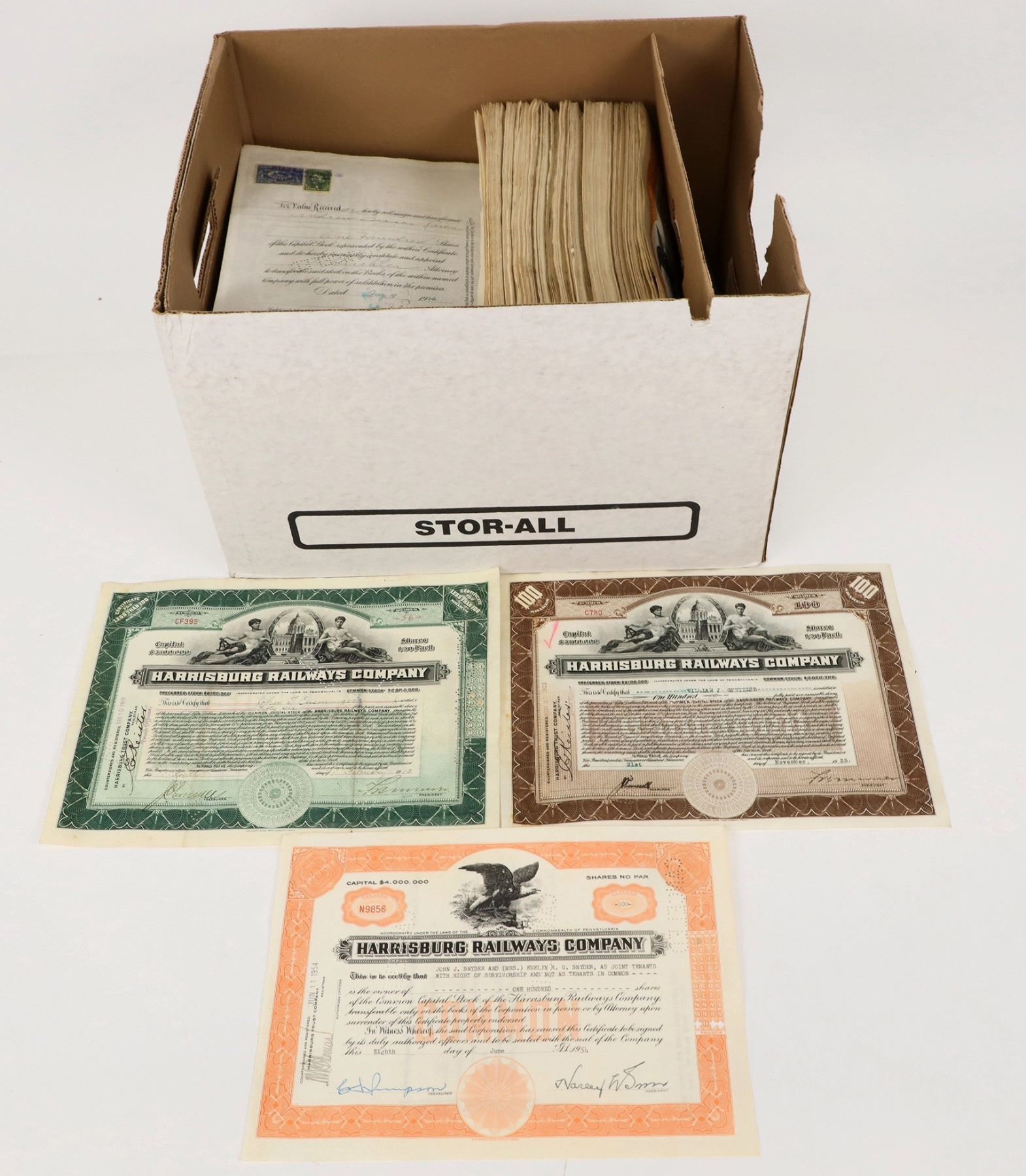 Harrisburg Railways, 5 different, various dates, about 100 blue, 150 brown, 200 orange, 400-500 green and about 600 non-pre-printed share certs. c. 1920s-40s