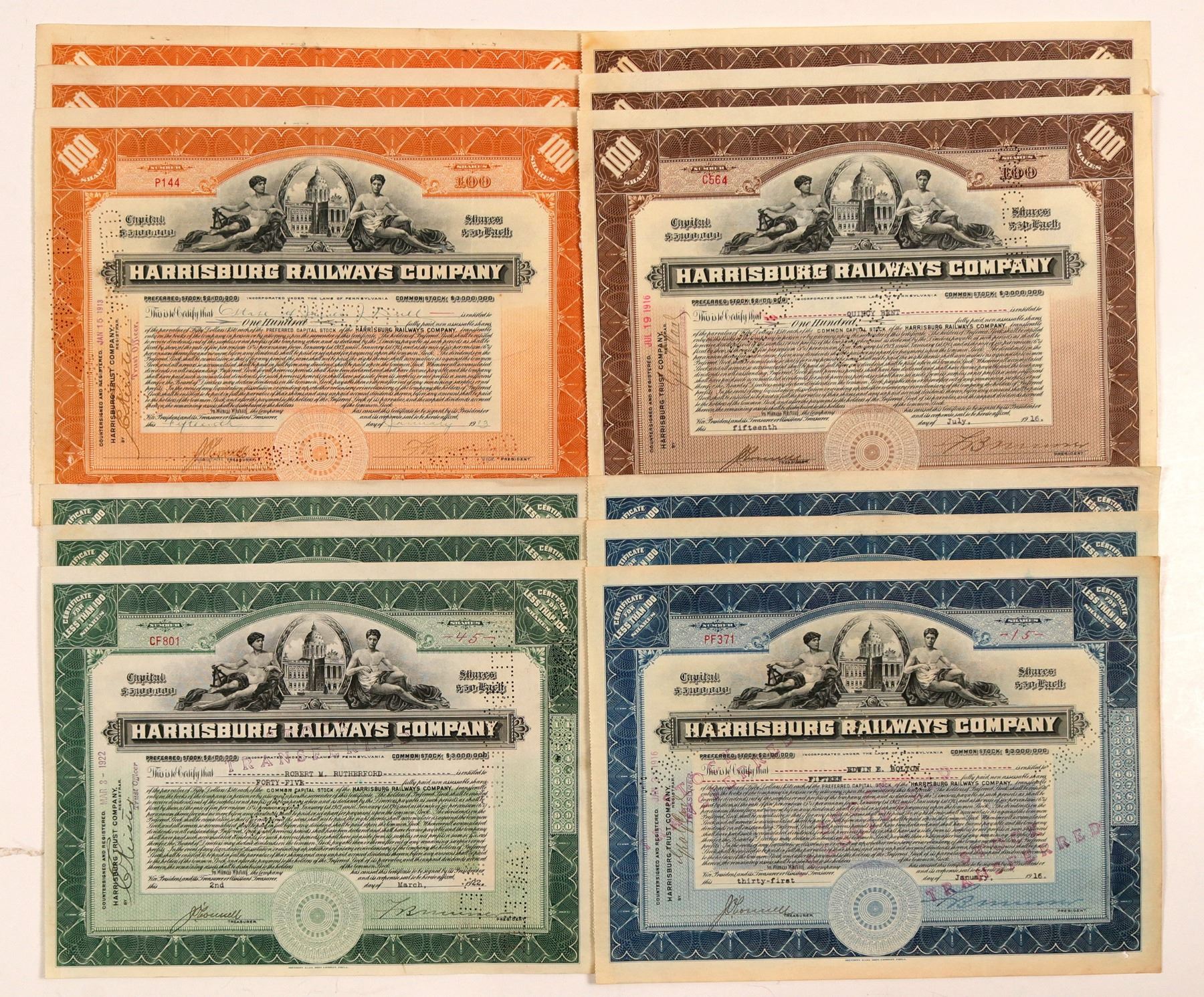 Lot of 12, three each of four varieties. Issued 1913-1922, punch cancelled. Orange, green, blue or brown borders. Allegorical vignette. 8.5 x 11.75" In 1913, the Harrisburg Traction Company created a subsidiary named Harrisburg Railways Company. Ken Prag Collection