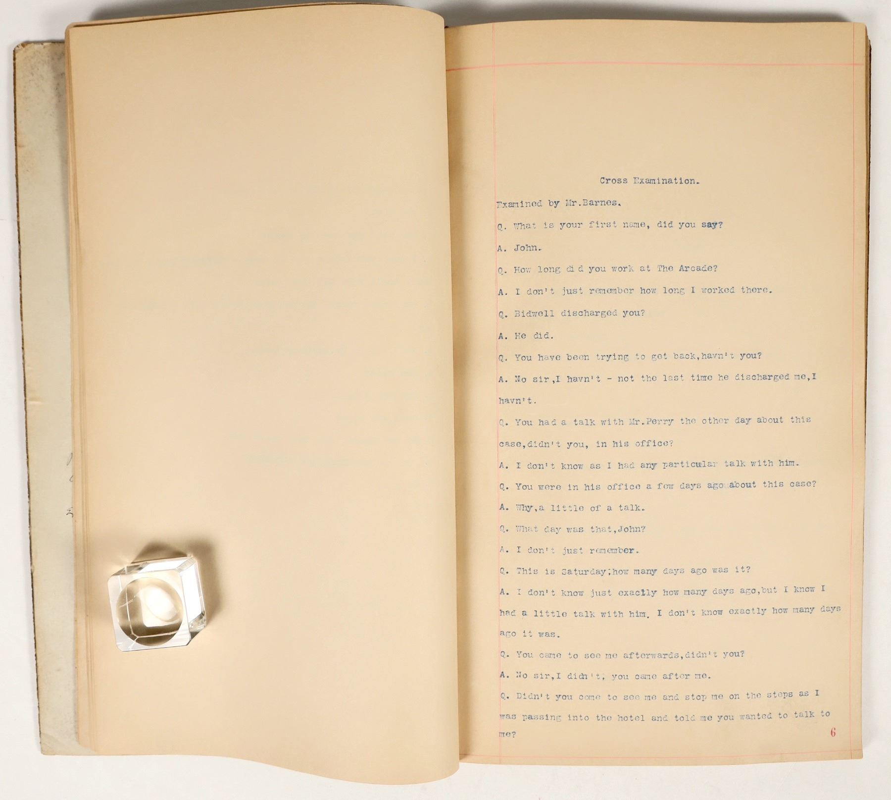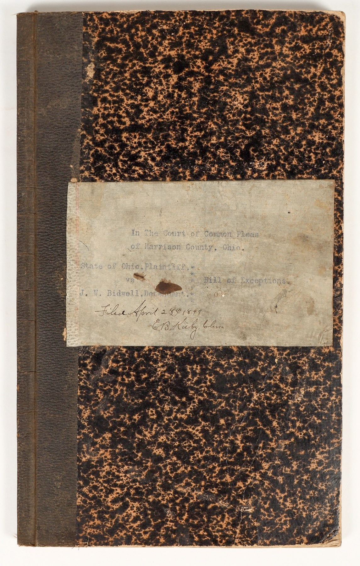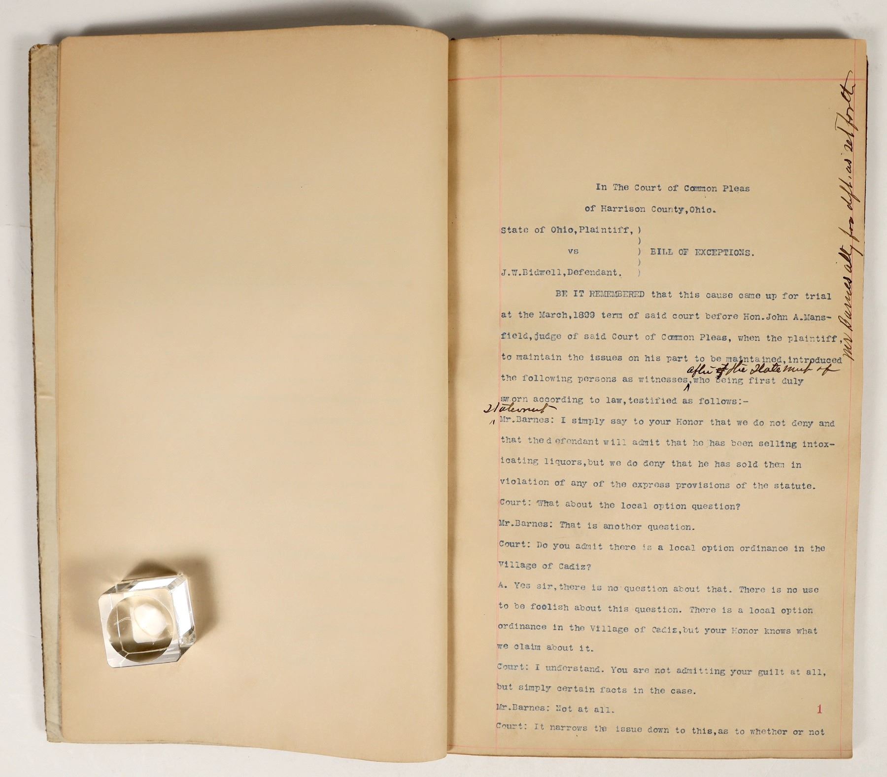 Typed deposition of witnesses for an 1899 court case against JW Bidwell, accused of illegally operating a bar out of his hotel basement and selling liquor to minors. 66 pages. 13 x 8"