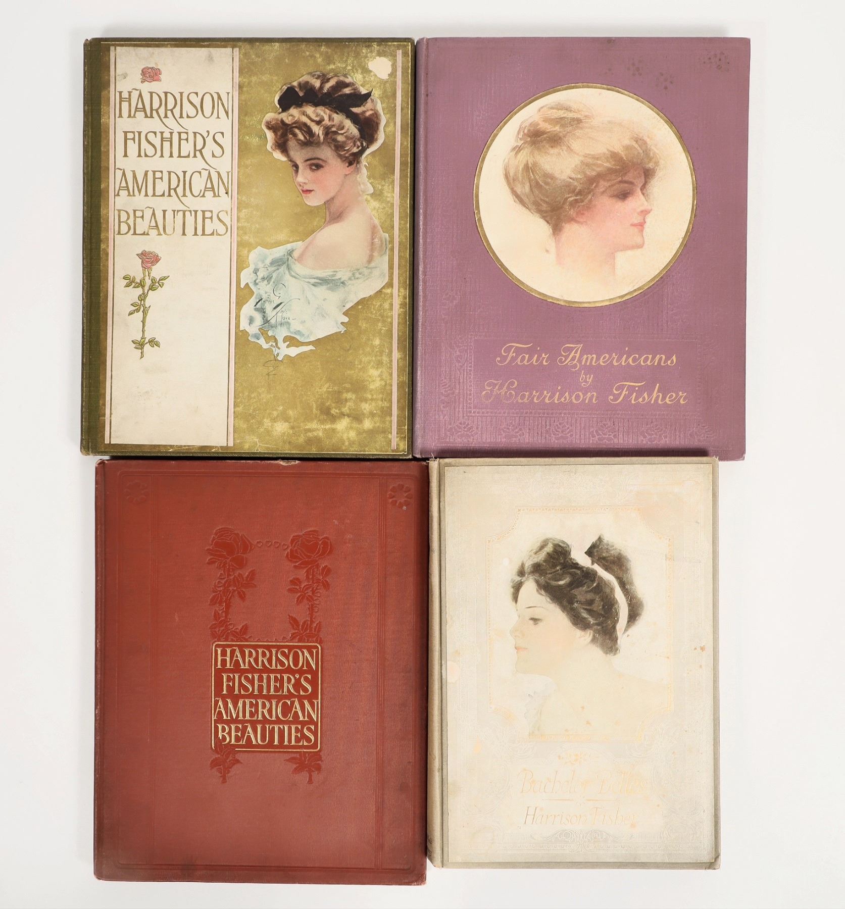Group of 4 books featuring art by American illustrator Harrison Fisher, published 1908 to 1911. Titles include 'Bachelor Belles', 'Fair Americans', and two copies of 'Harrison Fisher's American Beauties'. Fisher, whose work gained prominence in the late 1890s and continued until his death in 1934, was particularly well known for his illustrations of beautiful women. His work appeared in several magazines and newspapers, most notably on the cover of Cosmopolitan. The text pages of 'Bachelor Belles' show some toning and detachment from spine; otherwise, all four books are in good condition, and the illustrations remain crisp and colorful. See photos.