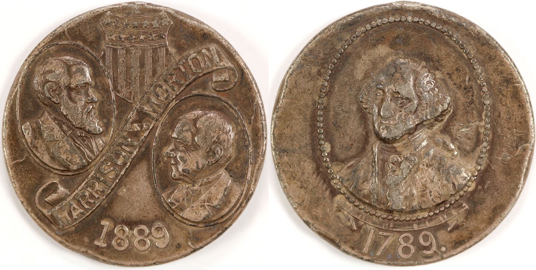 Obv.: portrait of Washington / 1789; Rev.: Portraits of Harrison & Morton / U.S. Shield / Harrison Morton / 1889. Br., Rd., rough edges, 37 mm. HWAC# 61916 Date: 1889 Location: