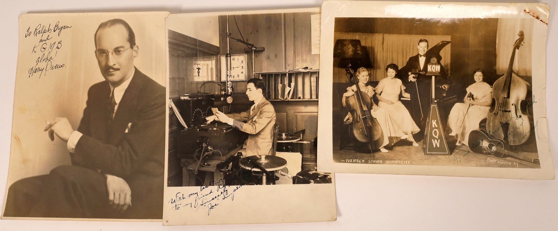 Lot of three 8 x 10 inch B&W photographs: 1) Harry Owens, inscribed "To Ralph Bryan and KGMB Aloha! Harry Owens." KGMB was a Honolulu radio station and his band was the Royal Hawaiian Hotel Orchestra. He is famous for having written "Sweet Leilani" which was a big hit for Bing Crosby and won the academy award for best song of 1937. Also included: 2) a KGMB signed photo of Joe Simpson, disc jockey and 3) the Iverson String Quartet. State: City: Date: Provenance: Salvatore Falcone Collection