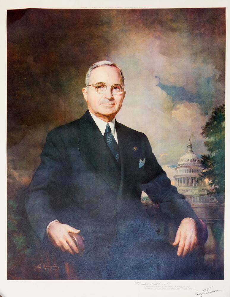 Full color reproduction of portrait of Harry S. Truman with capital building in background. Painted by Greta Kempton 1947, with artist signature visible at lower left. "We seek a peaceful world, A Prosperous World, A World of Good Neighbors, Living on Terms of Equality and Mutual Respect." (From Address to the Canadian Parliament , at Ottawa, June 11, 1947). Signature of Harry S. Truman at lower right. Published by Replica Arts, Inc., New York. Fine Arts Publishers. Copyright in all countries. Printed in U.S.A. Several tears around edges and small foldlines, otherwise good condition.