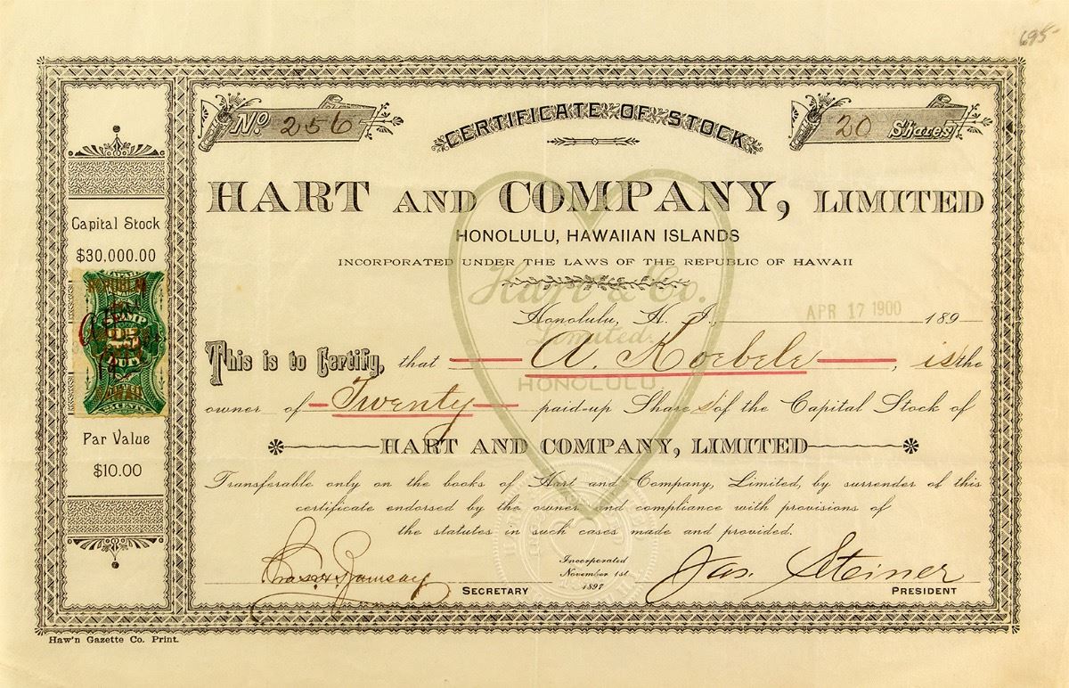 Inc. under the laws of the republic of Hawaii. Issued in Honolulu, April 17, 1900 for 20 shares. Signed by the president (Steiner) and secretary (Ramsay). Not cancelled. Very rare Hawaiian revenue stamp attached at left: green 25 cent Duty Stamp with gilt overprint "Republic of Hawaii / Twenty Cents." Pen cancelled stamp. Cert. printed by Hawaiian Gazette Co. Folds, otherwise very clean. (Prag Collection) City: Honolulu State: Hawaii Date: 1900 hwac# 34155