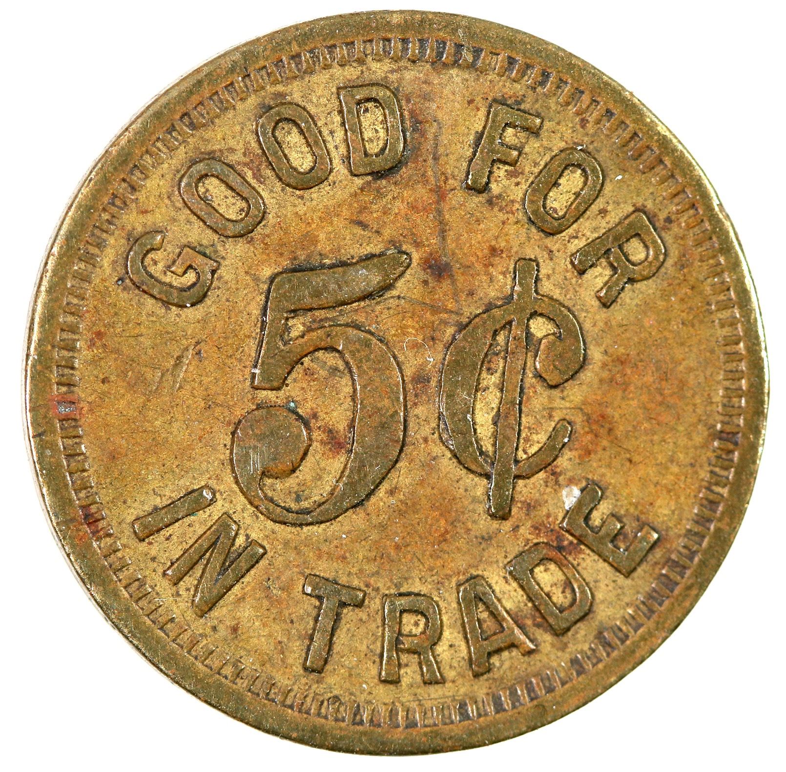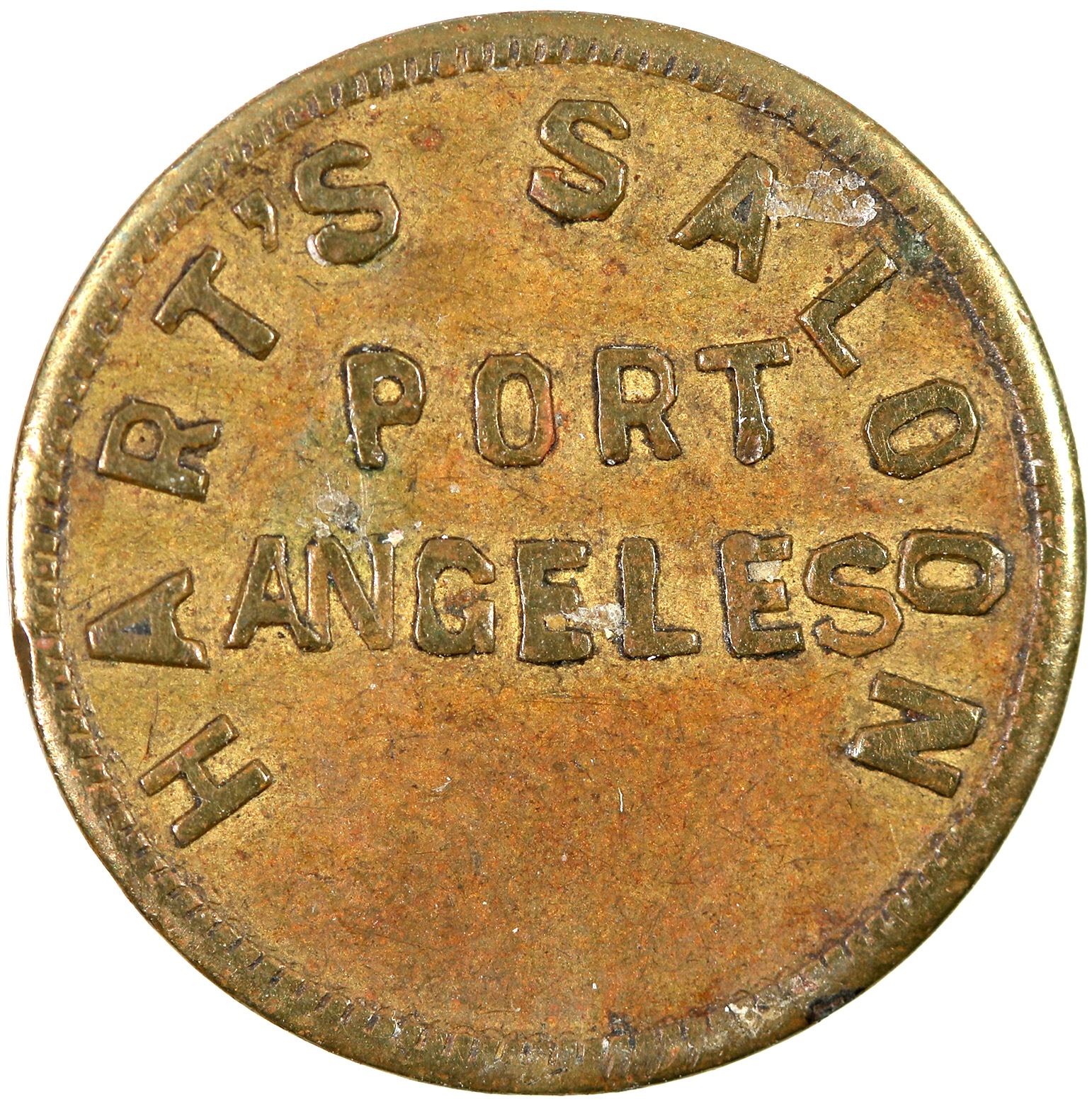 Clallam County: HART'S SALOON / PORT / ANGELES // GOOD FOR / 5¢ / IN TRADE; Br., rd., 21 mm.[ Port Angeles Washington