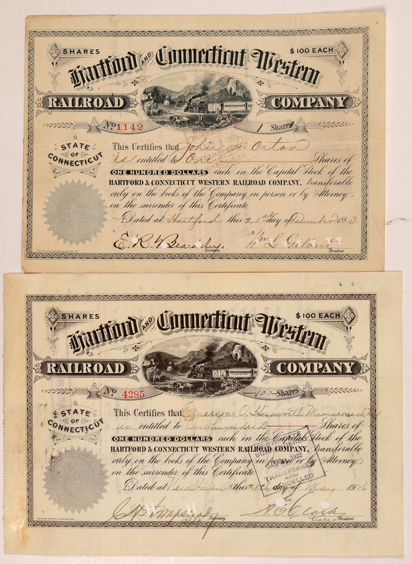 2 cancelled stock certificates for Hartford and Connecticut Western Railroad Co. @ $100 each share. Grey border and adhesive seal. 1 has adhesive RN stamp. Nice vignette of train on track going through mountains with farmers working with horses in foreground and to the right. Signed by secretary and vice president. Assigned. Hartford & Connecticut Railroad Co was in operation from 1881 - 1947 and was succeeded by New York, New Haven & Hartford Railroad.
