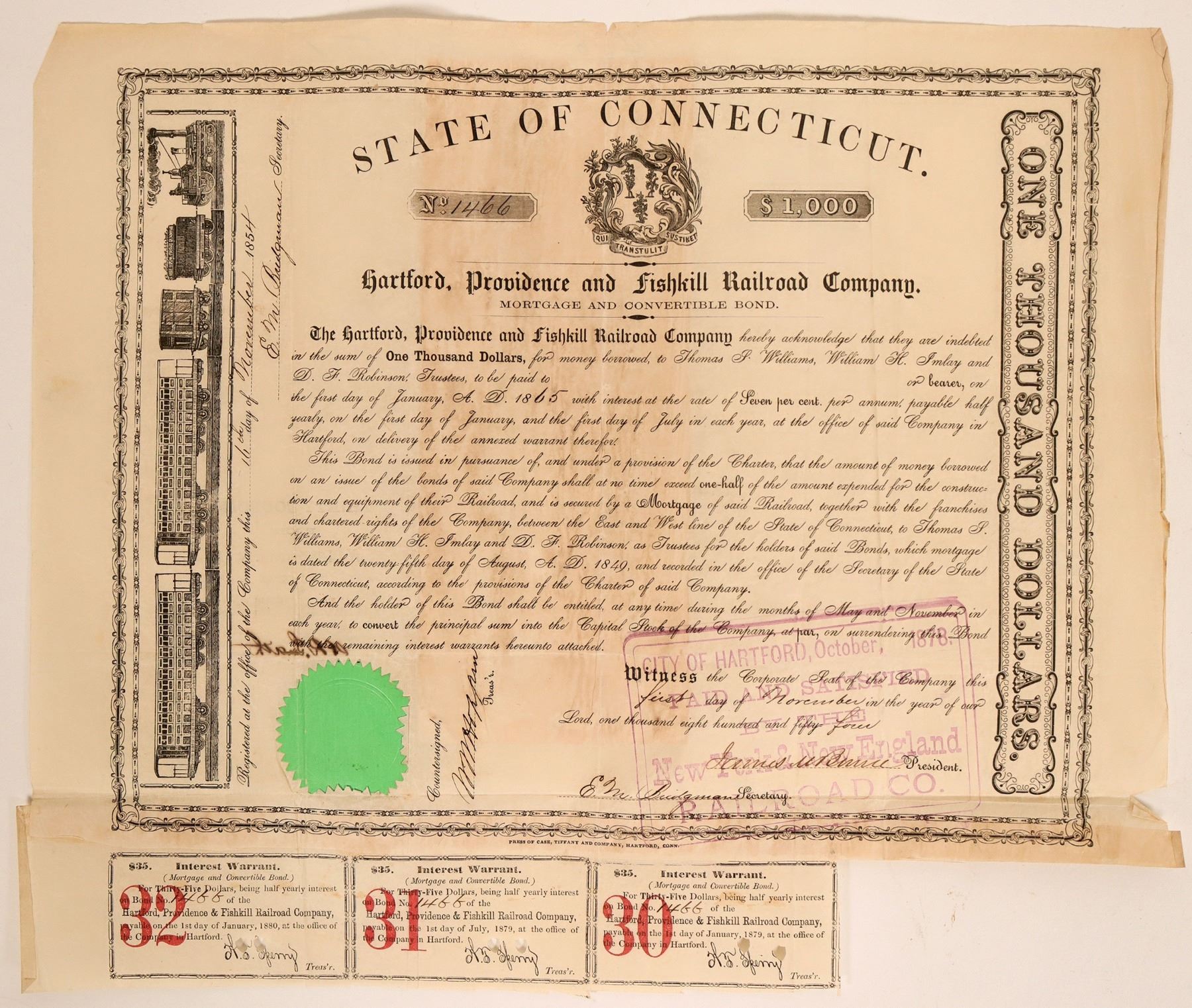 Chartered 1847 state of Connecticutt passing through several name changes with the final name change in 1976 to ConRail . #1466, I/C, $1000, 7% Mortgage and Convertible Bond issued Nov 1, 1854 signed by the Secretary. Black, green embossed seal, state seal top, left side cab-less train w/cars bottom to top, 3 coupons attached. Press of Case, Tiffany & Co printers. F