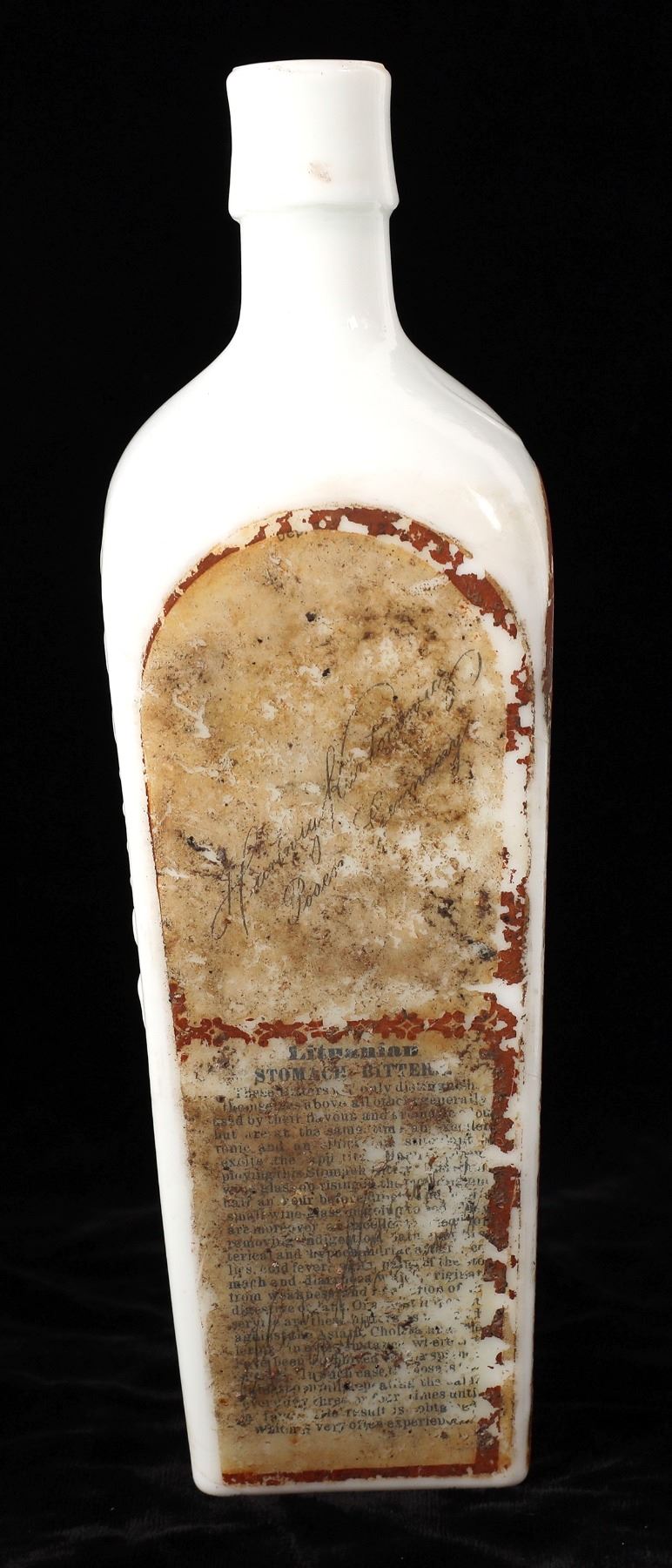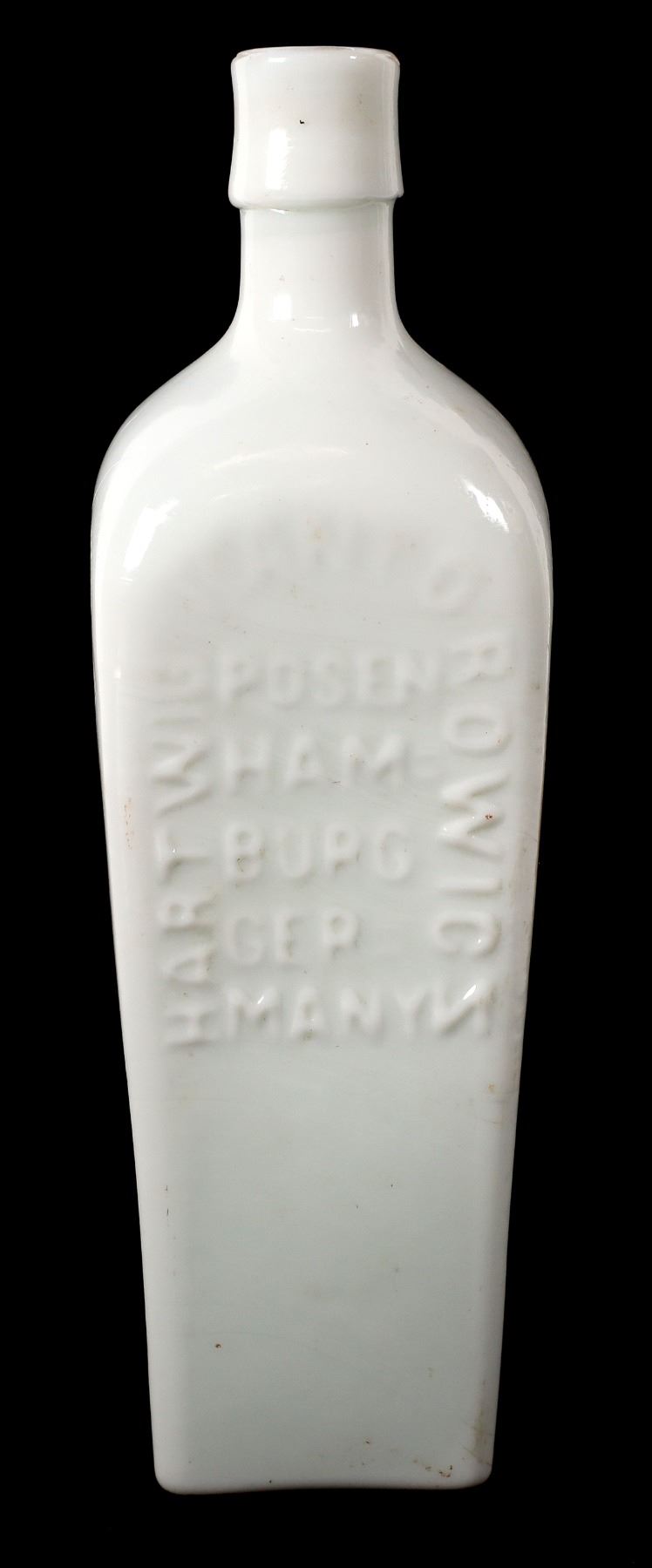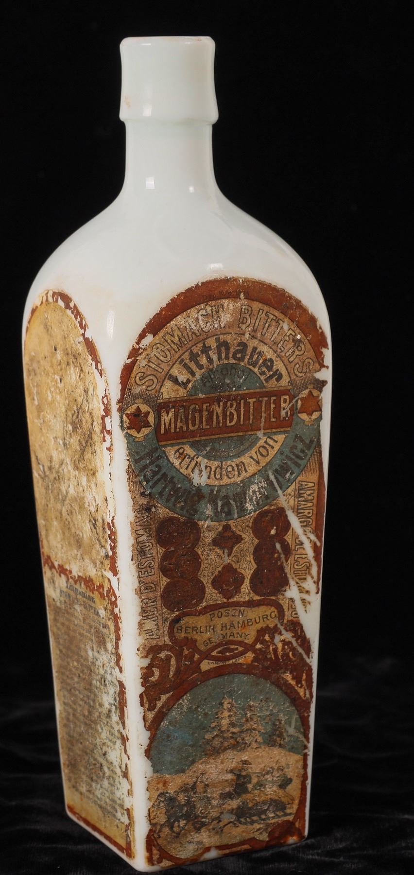 Milk glass Litthauer Stomach Bitters. Embossed on the front of the bottle is : Hartwig Kantorowicz( * Also extremely rare variant with the letter " Z", BACKWARDS... ( au n ad) / Posen / Ham- / Burg / Ger/ Many // Highly Graphic original labels on two sides. Some dis-colorization, but can be read. Applied top. Overall, a nice item. zGermany Fred Holabird Collection