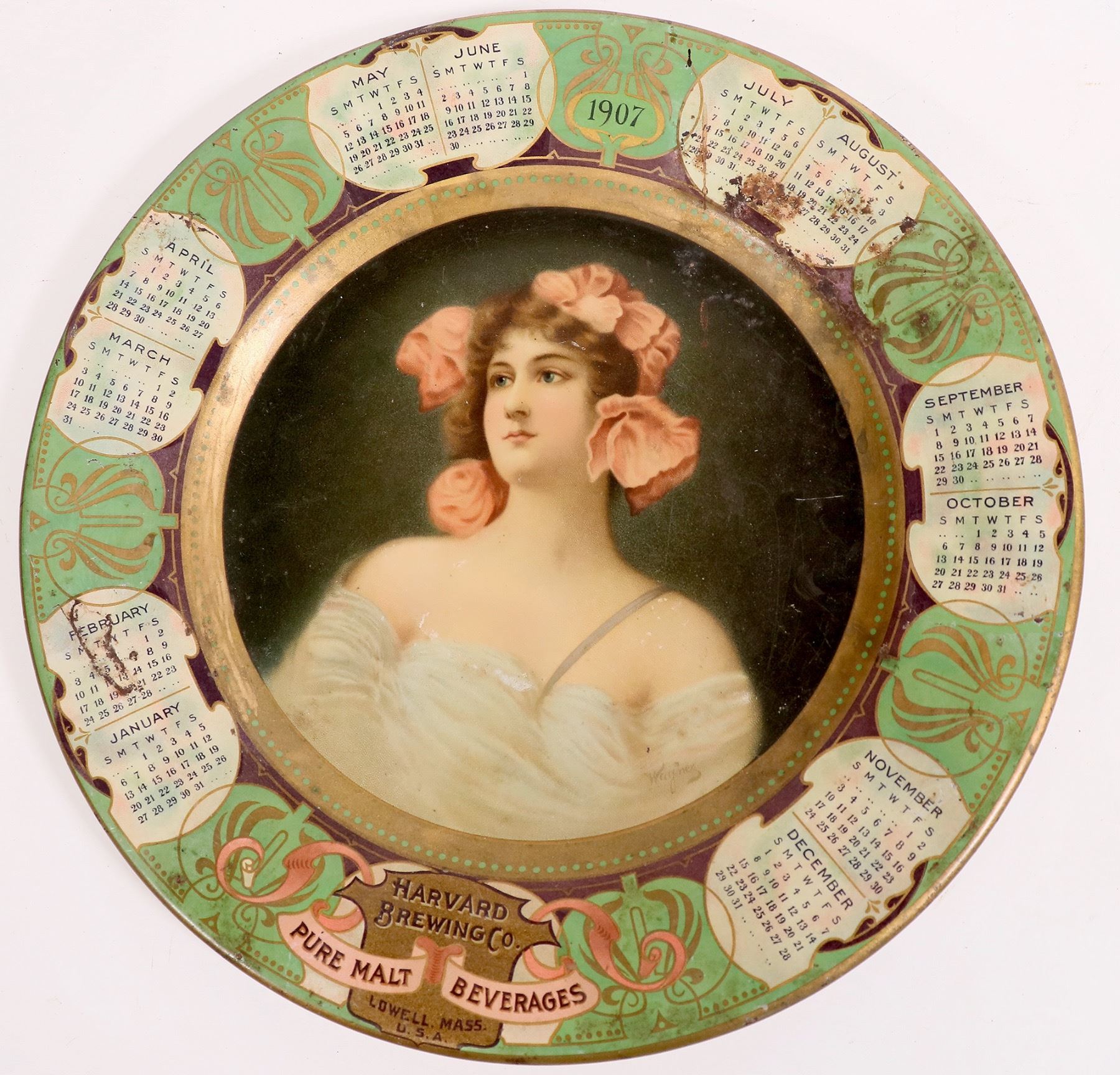 This beer tray is for a single serve from the "Harvard Brewing Co. of Lowell, Ma. / Pure Malt Beverages". The border is outlined with the date calendar for 1907 on a light green background. "Vienna Art Plates Pat. Feb. 21st, 1905". Mounting holes with string on the back. The image is of a beautiful young lady with flowers in her hair. Very good condition. Surface scuffs. 10 in. Lowell Massachusetts c. 1907
