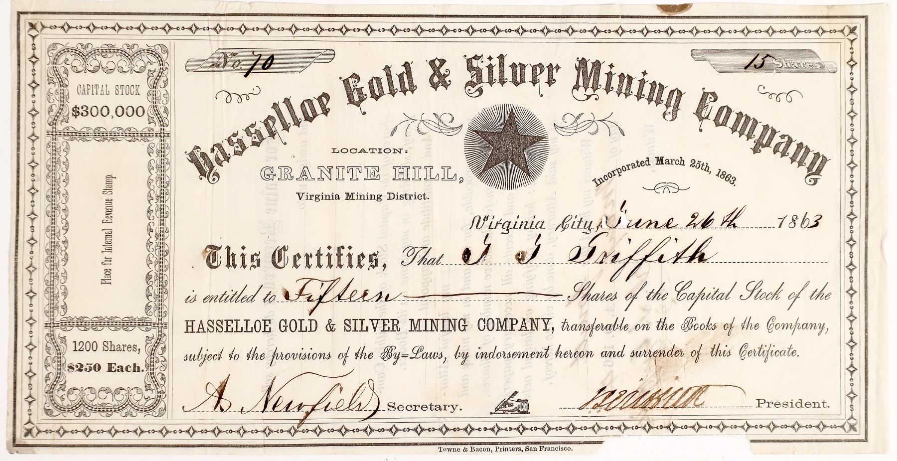 Location: Granite Hill, Virginia Mining District (printed under title). Inc. March 25th, 1863. No. 70, issued for 15 shares to J. J. Griffith on June 26th, 1863 in Virginia City. Signed by the president (?) and secretary A. Newfield. Endorsed on reverse. Not cancelled. Black border and print. Vignette of star. Printed by Towne & Bacon. Folds, creases, a few stains, a hole in the dateline, and a piece missing from the bottom right border. J. J. Griffith is listed as an attorney in Virginia City. Newfield is not listed. Research on Griffith who would leave the aea on April 24, 1864. Granite Hill Nevada 1863 Joe Elcano Nevada Mining Stock Collection