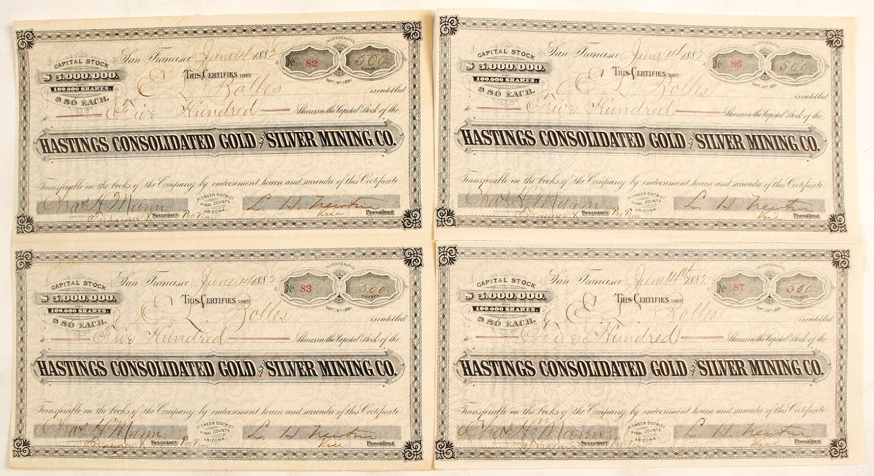 Lot of four. Numbers 82 and 83 are still attached. This would make a nice framed piece. Also numbers 86 and 87. All issued to ES Bolles for 500 shares in 1882. No edge, corner or color issues on any of the stocks. The town of Superior was laid out here in 1900. (Laguna Collection) HWAC# 62969 Date: Location: Pinal, Pioneer, Arizona