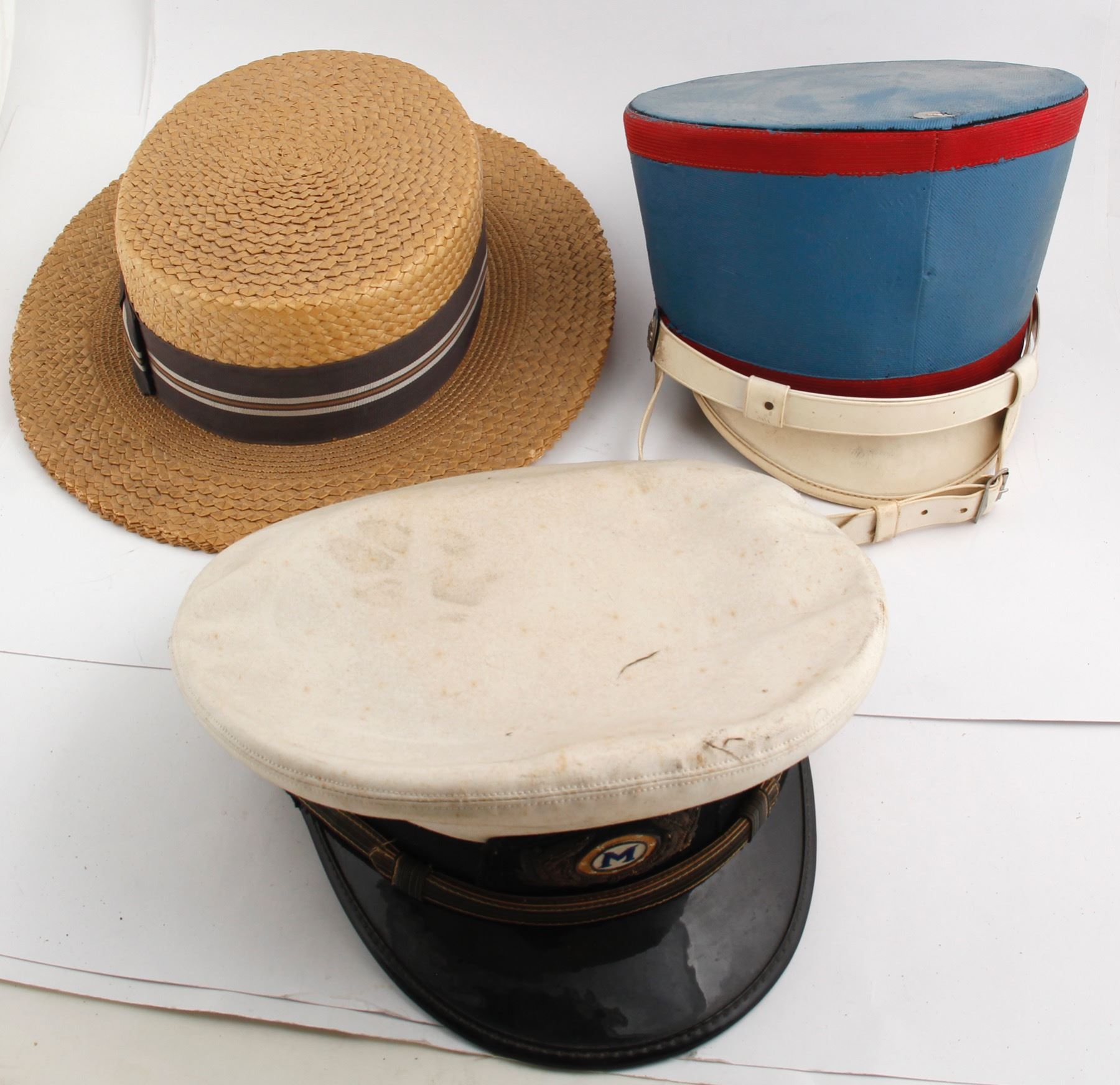 Three hats from the music business. The first one is a classic straw hat used on stage circa 1920. The second hat is a classic parade band hat in blue and red with a white strap. The third hat is equivalent to a bandleaders hat with an 'M' emblem on the front made by Joe Harris Company, San Francisco. We are not quite sure what the origin is of this third hat. All three hats in excellent condition. Hamilton Hat Collection.