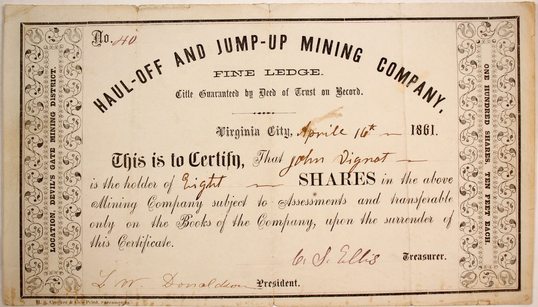 We can't decide what is more interesting about this certificate: the name, the incredibly early date or the person who bought this certificate! The Haul-Off and Jump-Off Mining Company was located on the Fine Ledge. This is cert #40 for 8 shares to John Vignot. It is signed by CS Ellis and LW Donaldson. HS Crocker printer. Location: Devil's Gate Mining District. Dateline VIrginia City April 16, 1861. Not cancelled. Discoloration on edges and a few small tears. Over all Fine! John Vignot's cabin built in 1859 was one of the first four or five substantial buildings at Gold Hill. In 1861 he and three others, Including McLaughlin, surveyed the area around Gold Hill for water. L William Donaldson, WW Caperton and the Ophir Mining Company on August 12, 1861 sold land with water privileges and mill sites between Virginia City and American Flat to the Washoe Turnpike Company. In the 1861 Nevada Directory Ellis was owner of the Virginia Saloon. Donaldson, Ellis and Vignot can all be found mentioned throughout the book "Records of Carson County in the Utah and Nevada Territories" by Ellison. Prag Collection State: Nevada City: Devil's Gate Mining District Date: 1861 HWAC# 84517