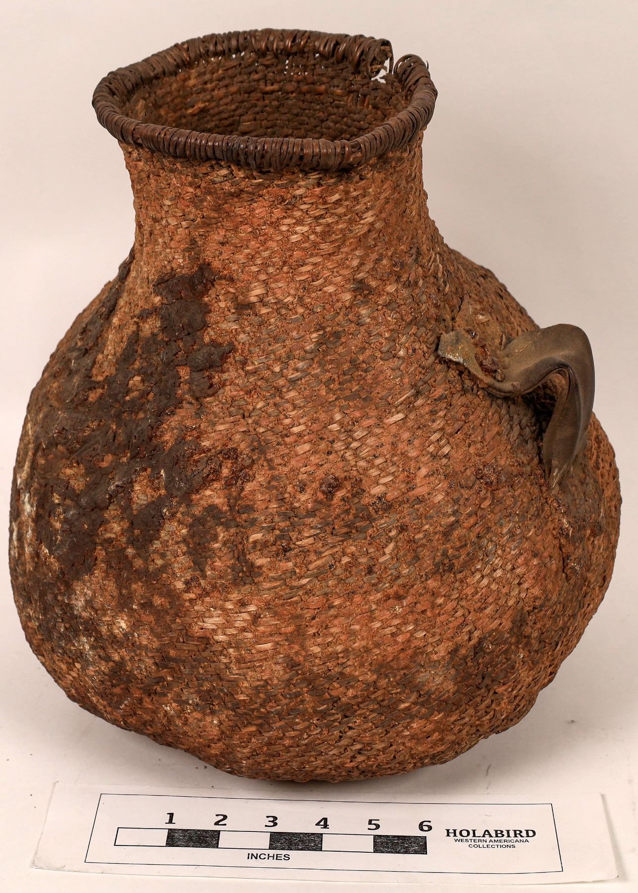 Large woven basket, once completely covered with pine pitch, originally made for carrying water. Label in the opening reads: 1900-1920 Havasupai / Pitch Water Canteen / BXAXXFOB17 (perhaps an early catalog number). No longer watertight, some wear at the bottom, and damage to the original leather loops. Old pitch coating is friable. Approx. 12 inches in diameter and 13-1/2 inches tall with a 6 x 7-inch opening at the top. Please see the photos for design and condition details.