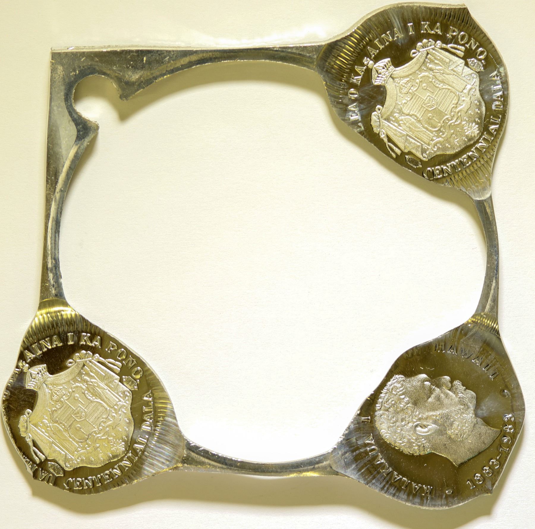 King Kalakaua I portrait, Hawaiian Seal reverse, 1881-1983 dates. 4 x 4 inches.