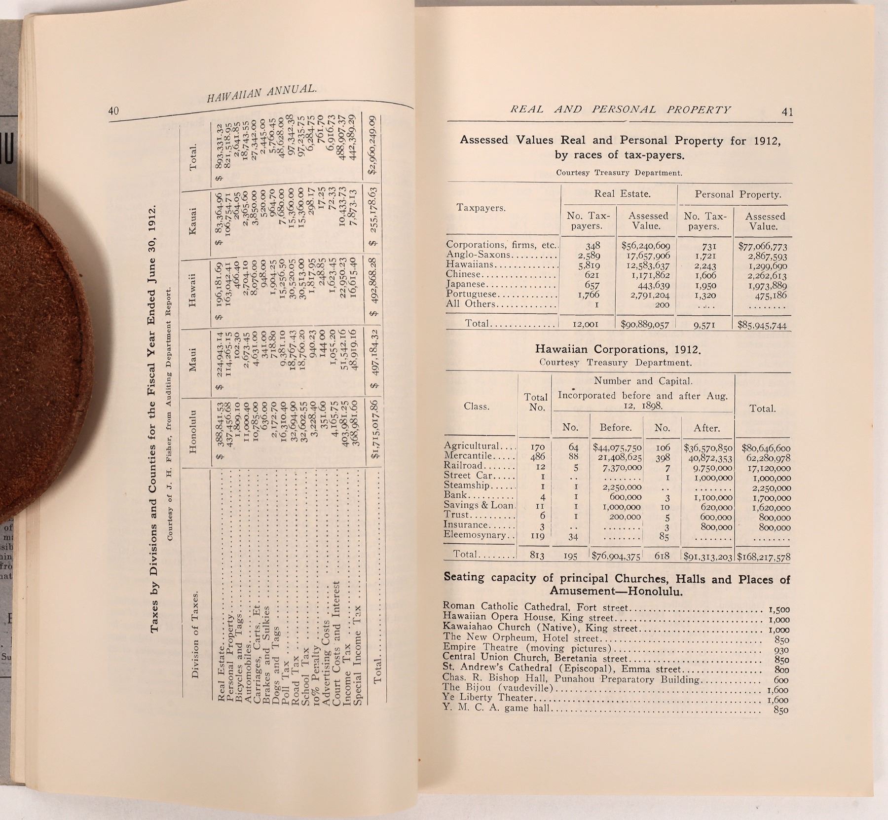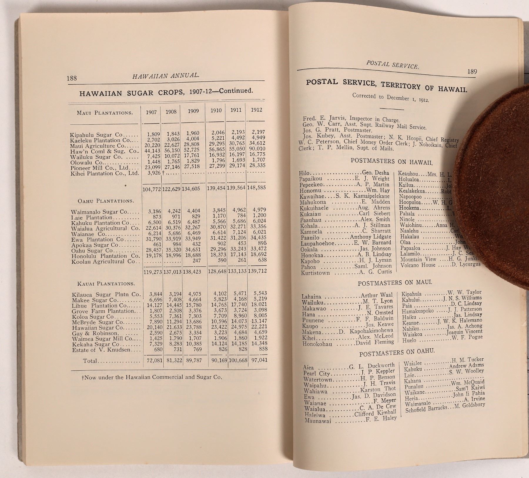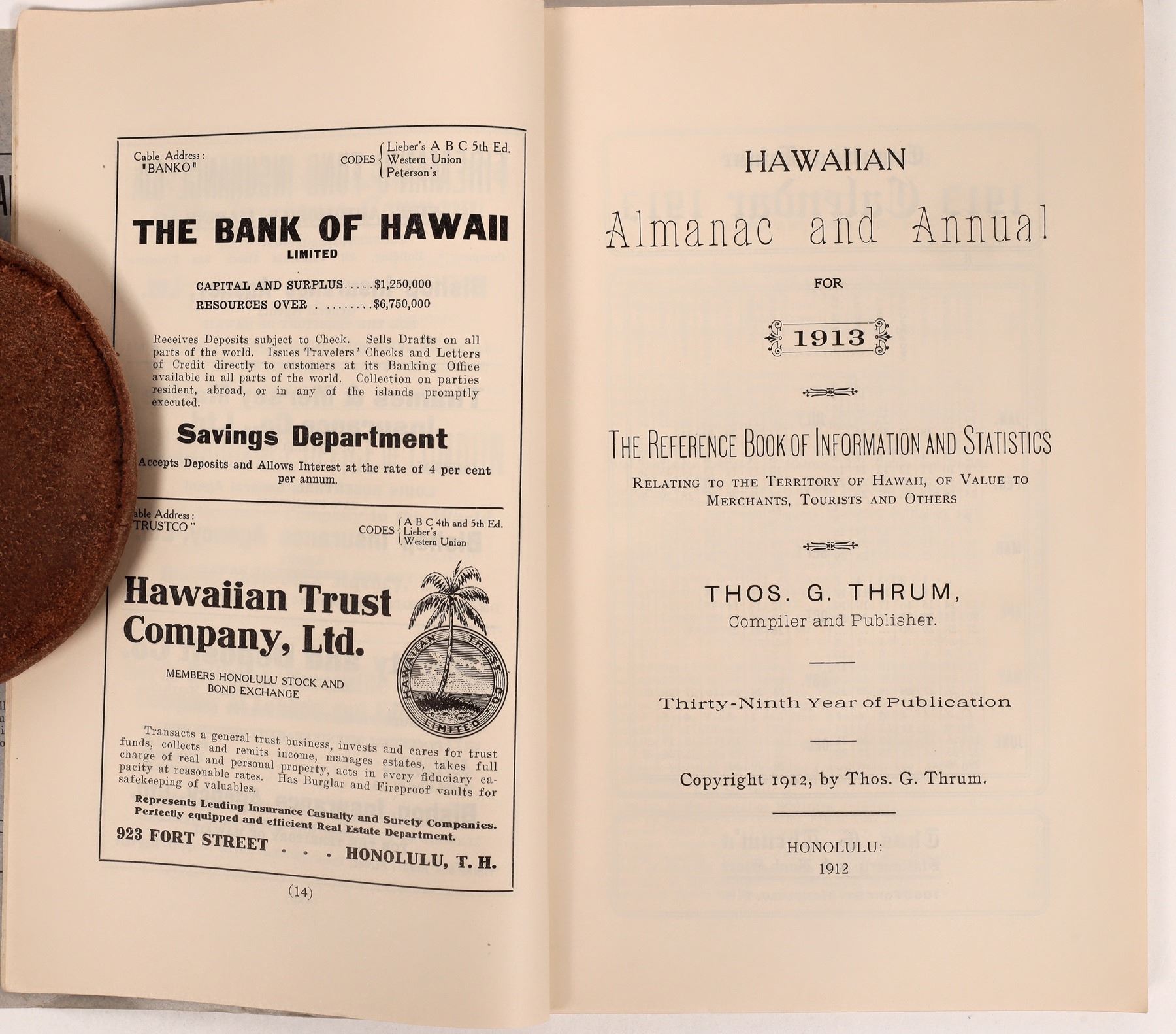 Lot of 2. 1) The Hawaiian Annual. "The Recognized Book of Information About Hawaii." Thos. G. Thrum, Publisher, Honolulu. 1913. 209pp. with index. Full of information, statistics, and advertisements. 9 x 5.5" 2) Nice pictorial lettersheet for the Union Feed Company, Limited. Dateline Honolulu, T.H. Aerial vignette of the factory on the coastline.