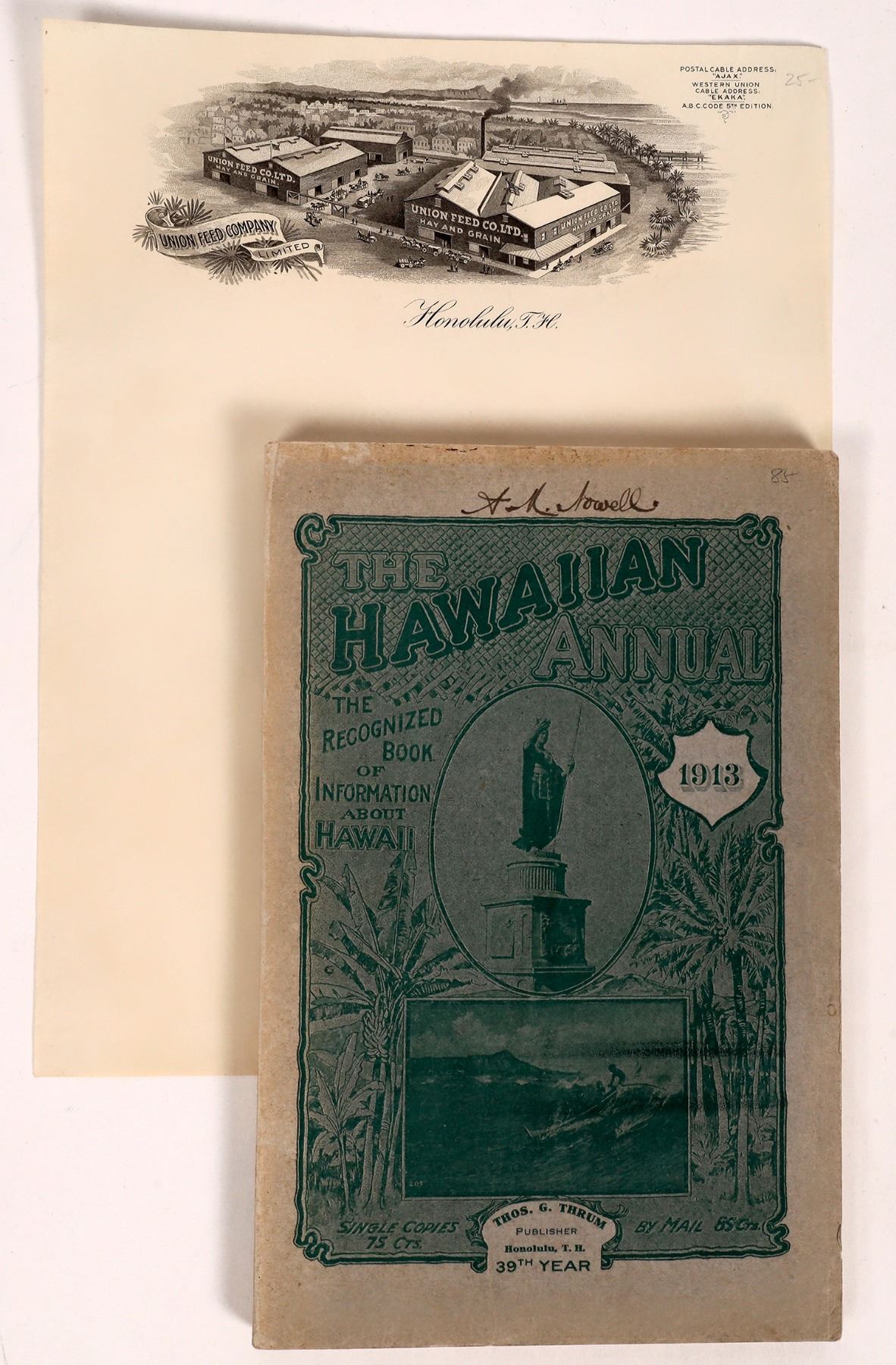 Lot of 2. 1) The Hawaiian Annual. "The Recognized Book of Information About Hawaii." Thos. G. Thrum, Publisher, Honolulu. 1913. 209pp. with index. Full of information, statistics, and advertisements. 9 x 5.5" 2) Nice pictorial lettersheet for the Union Feed Company, Limited. Dateline Honolulu, T.H. Aerial vignette of the factory on the coastline. Hawaii 1913 Ken Prag Collection