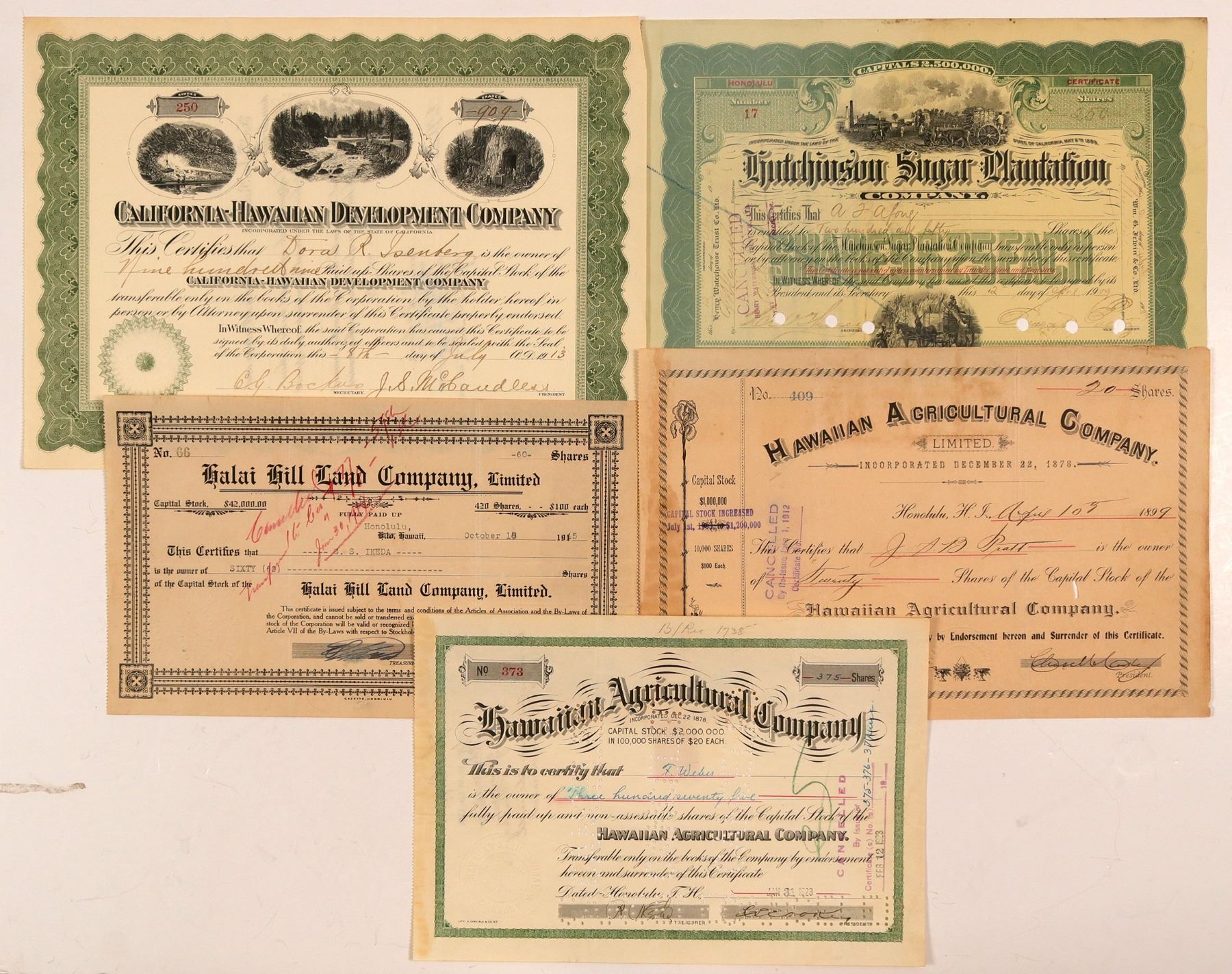 Lot of 5 different. Included: Halai Hill Land Company, Ltd. (1945); Hawaiian Agricultural Company (1899, Honolulu); different Hawaiian Agricultural Co. (1923); Hutchinson Sugar Plantation Company (1909, vignettes of sugar plantations); and California-Hawaiian Development Company (1913, mining vignettes). Fair condition. Please inspect. Ken Prag Collection
