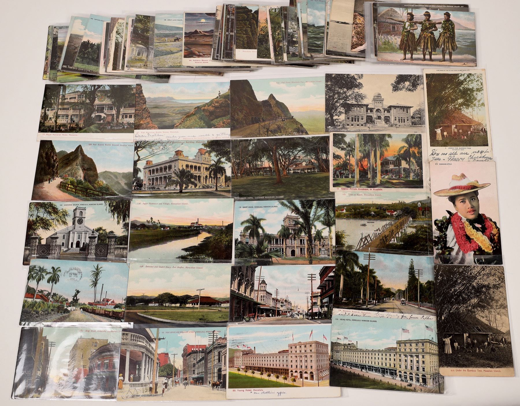 Hawaiin Pioneer Postcard Collection from Island Curio Company. Lot of 119 Private Mailing Cards printed by the Island Curio Co. of Honolulu. Some duplication, but most different! This is an amazing Hawaii pioneer postcard collection, one of the best Hawaii postcard lots we've offered. Includes a rare view of the interior of the Island Curio Company store. Many volcano views; surfing; Honolulu waterfront; Waikiki Beach; Hilo; Capt. Cook's Monument; Native weavers; hula dancers; hotels and street scenes in Honolulu; and more. Please inspect. City: State:Hawaii Date: