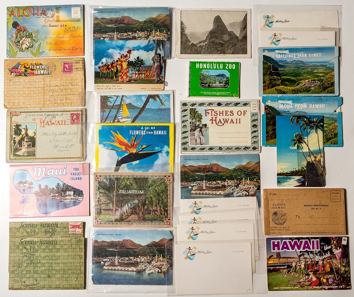 Most are vintage postcard packets. A few single cards, one includes black sand and one has a small rubber hula girl. City: State: Hawaii Date: ID# 29811