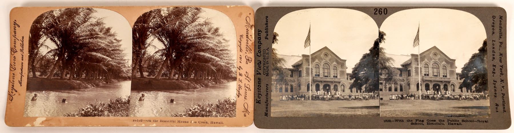 Two beautiful images on stereo view of Hawaii. Included are images of Mauna Loa Creek and The Royal School in Honolulu. Both are taken by The Keystone View Company with a 1904 copyright. Good condition. Please see photos for more detail and condition.